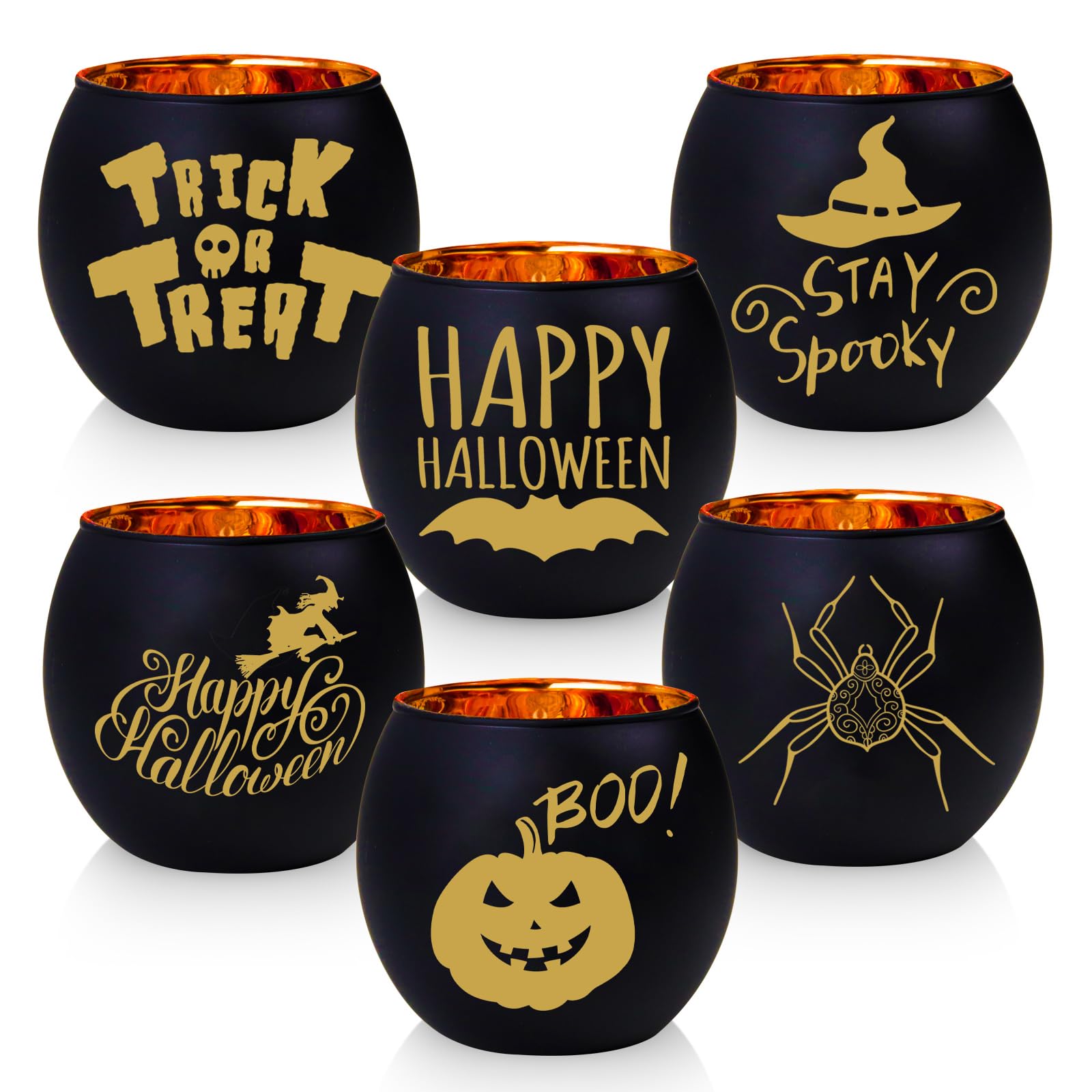 - Cute Halloween Decor: Each Halloween votive candle holder features a black frosted exterior that beautifully contrasts with a radiant gold interior. These votive candle holders are crafted using precise laser engraving techniques that add pumpkin, spider, trick or treat and other Halloween characters to each piece. The Halloween designs cast enchanting shadows, making them a perfect addition to your Halloween decorations