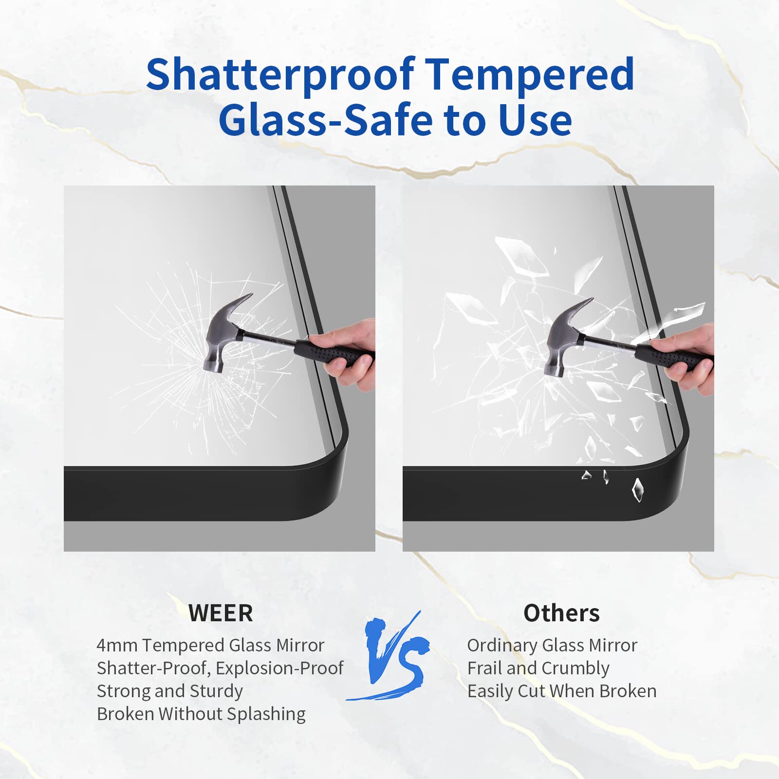 - 【Shatterproof Tempered Glass】: All WEER matte black mirror for bathroom is built with 4MM tempered glass which is shatter-proof, burst-proof and more safer to use. The shatterproof film is the important layer that will not splash into pieces when it's broken;