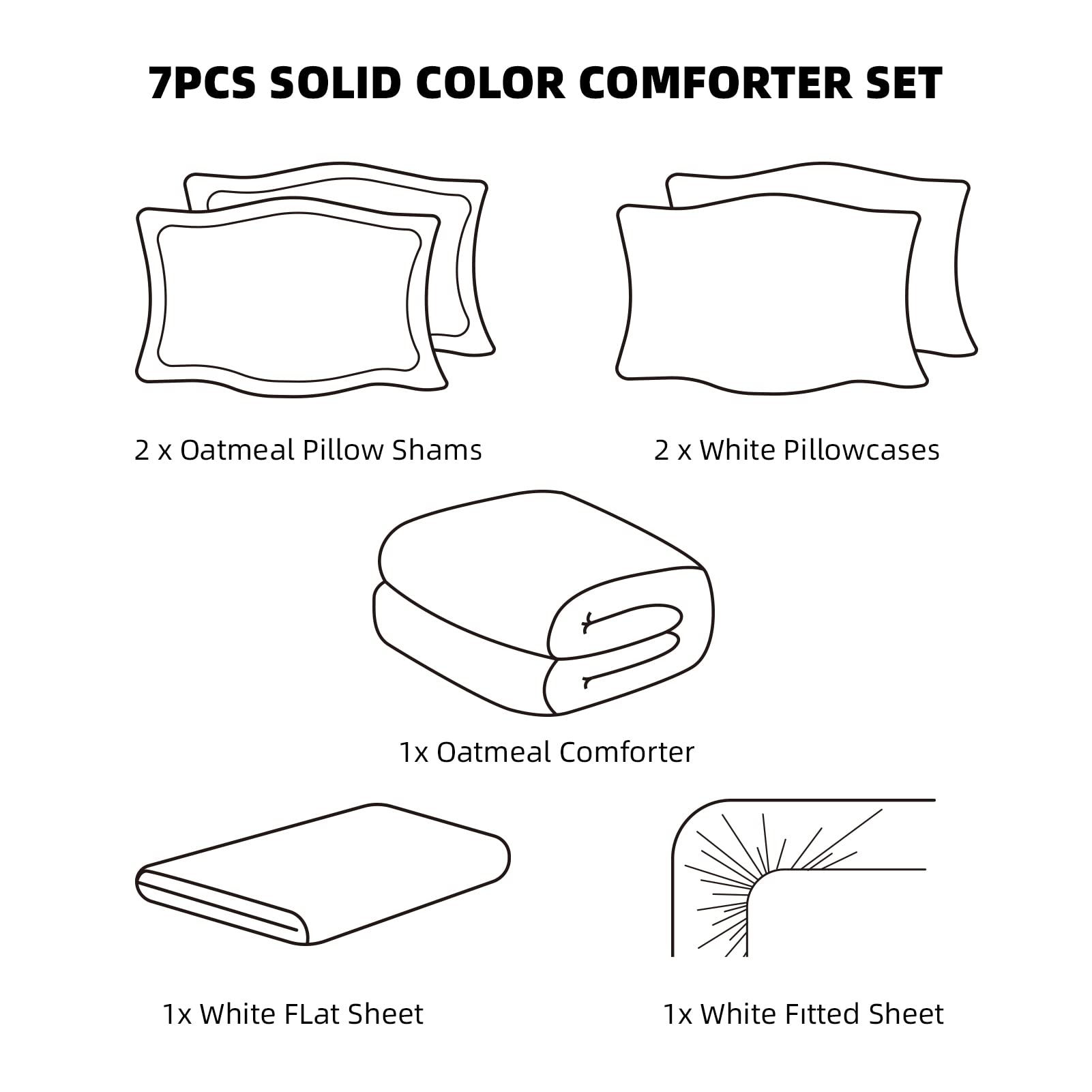 - 【What You Can Get】7 pieces queen comforter set comes with everything you need: A oatmeal comforter(90" * 90"), 2x oatmeal pillow shams( 20" * 26"), 2x white pillowcases ( 20" * 30"), 1x white flat sheet(90" * 102"), 1x white fitted sheet(60" * 80" *14").