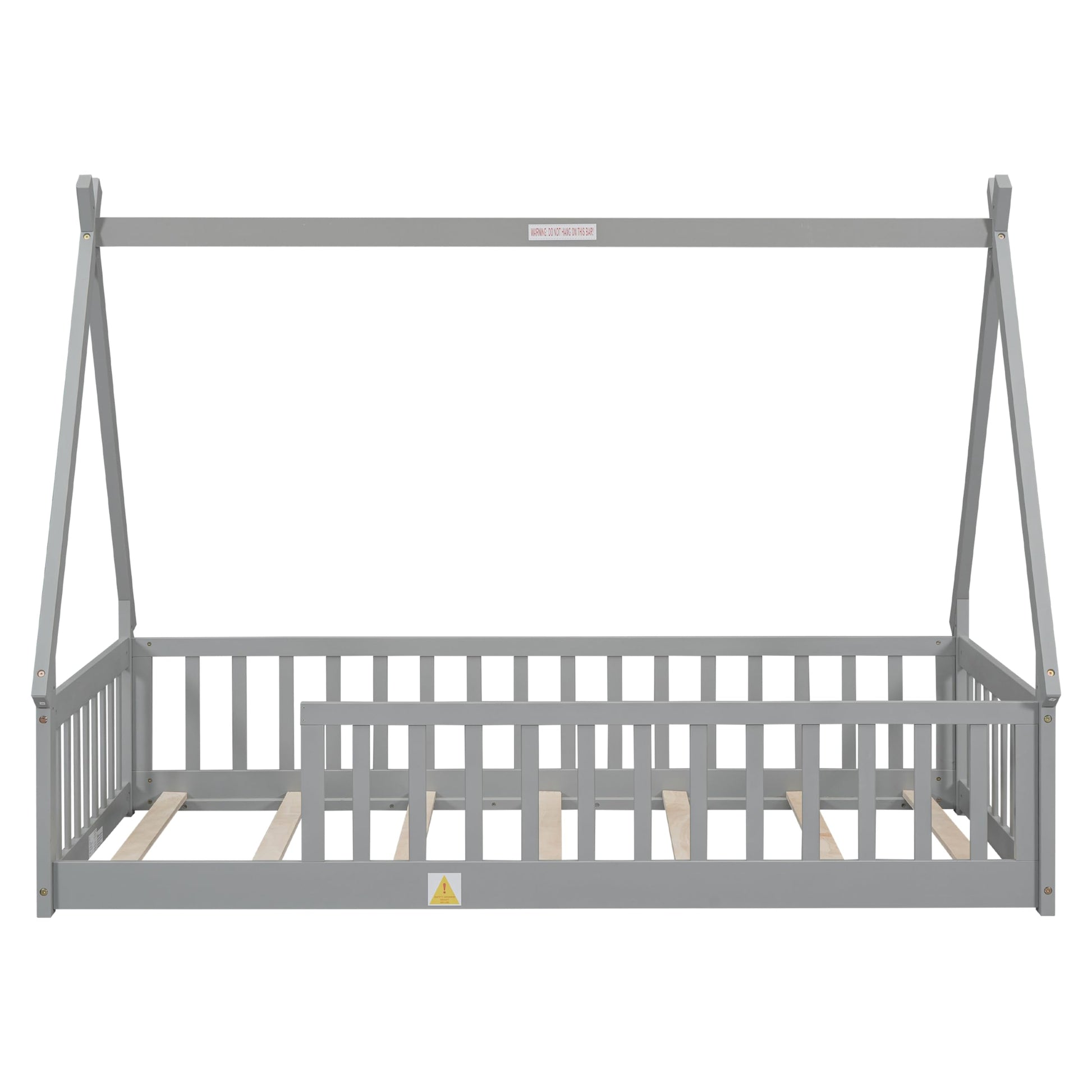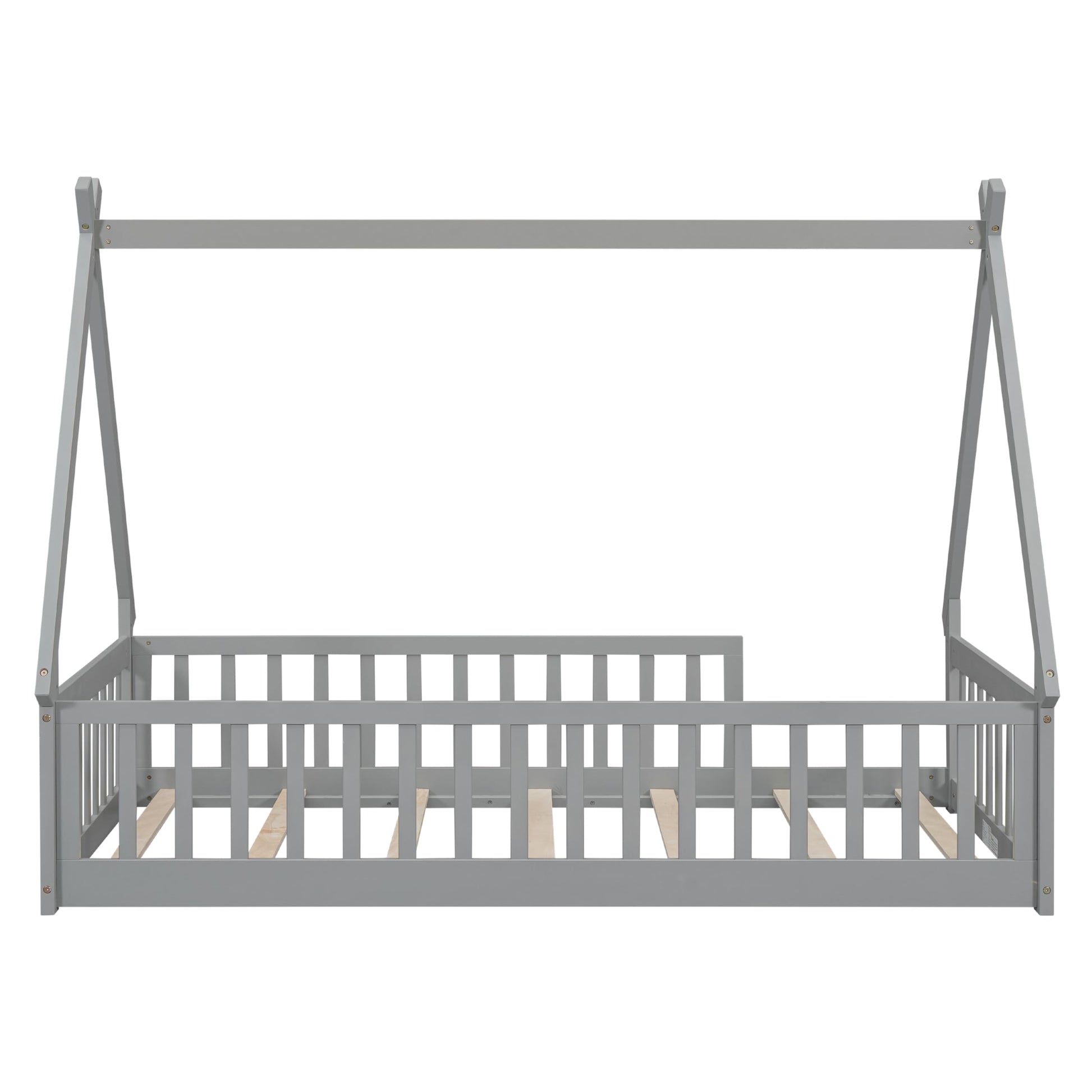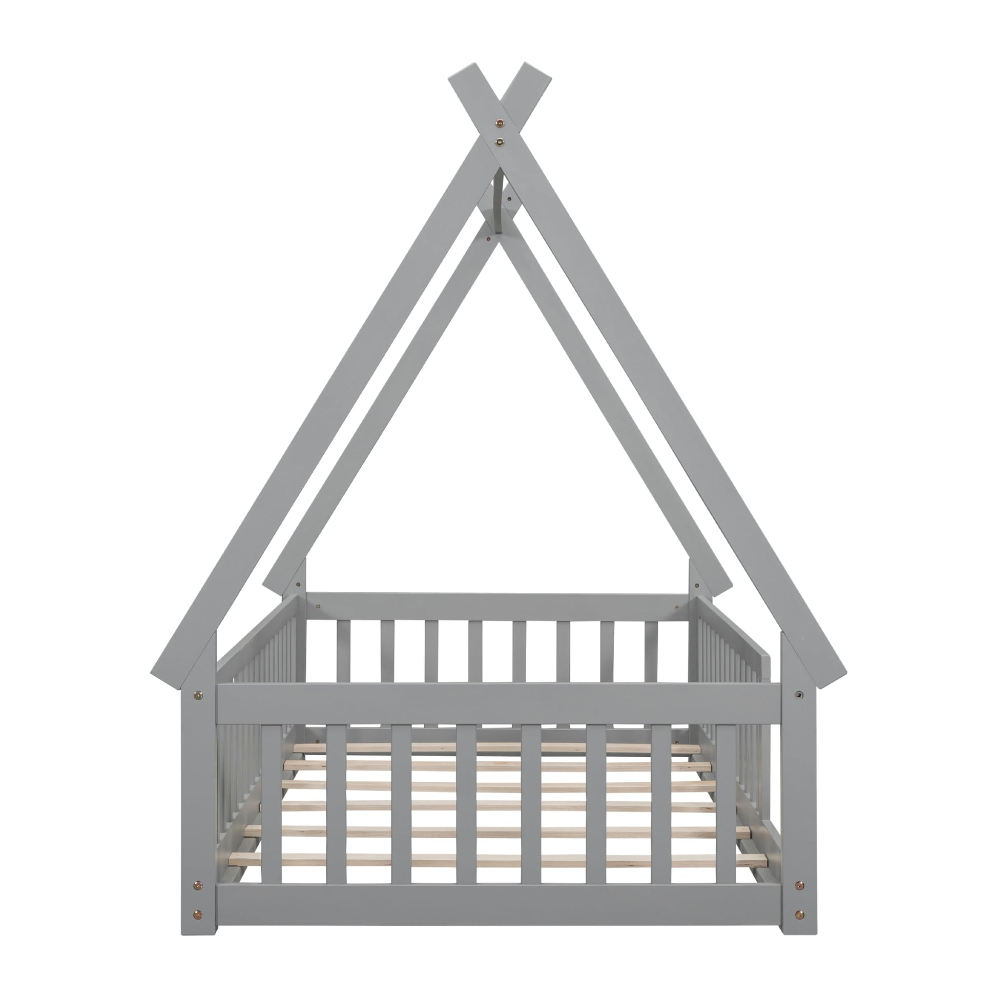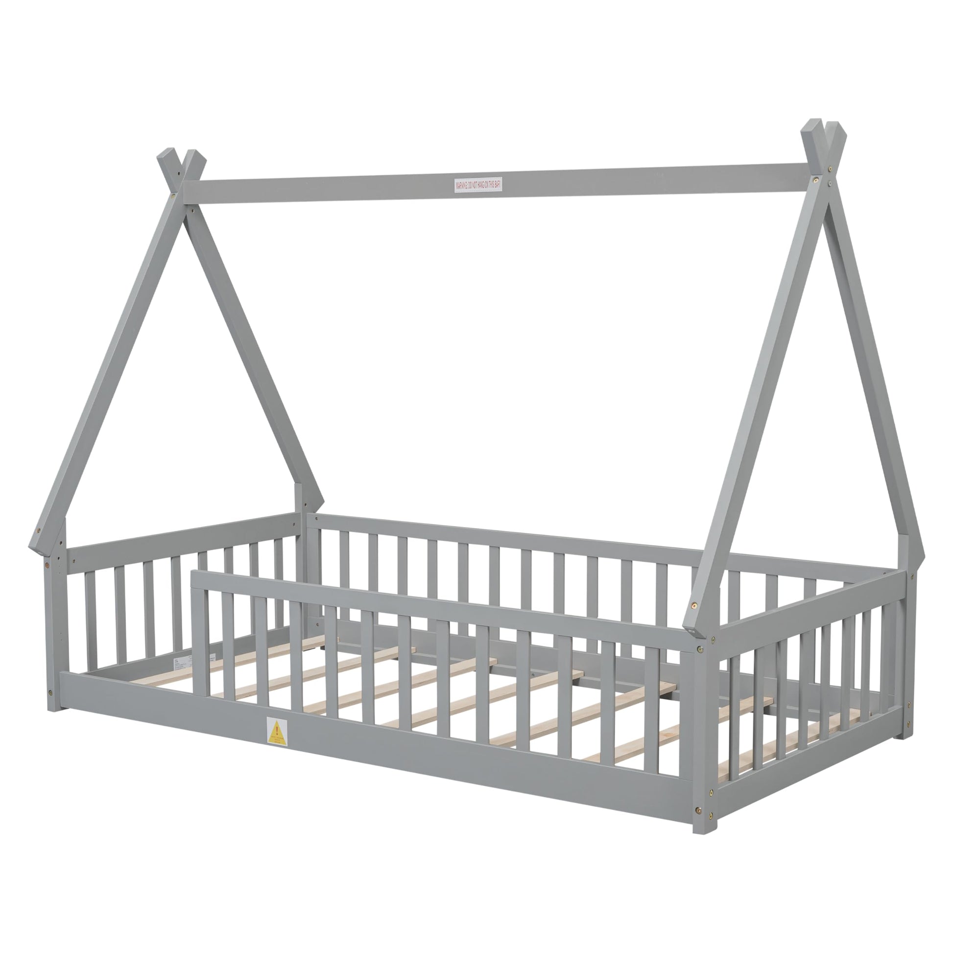 Wekuku Twin Tent Shaped Floor Bed for Kids – Teepee with Guardrails Slats, Grey – Low Profile Bed Frame for Bedroom, Playroom, Nursery