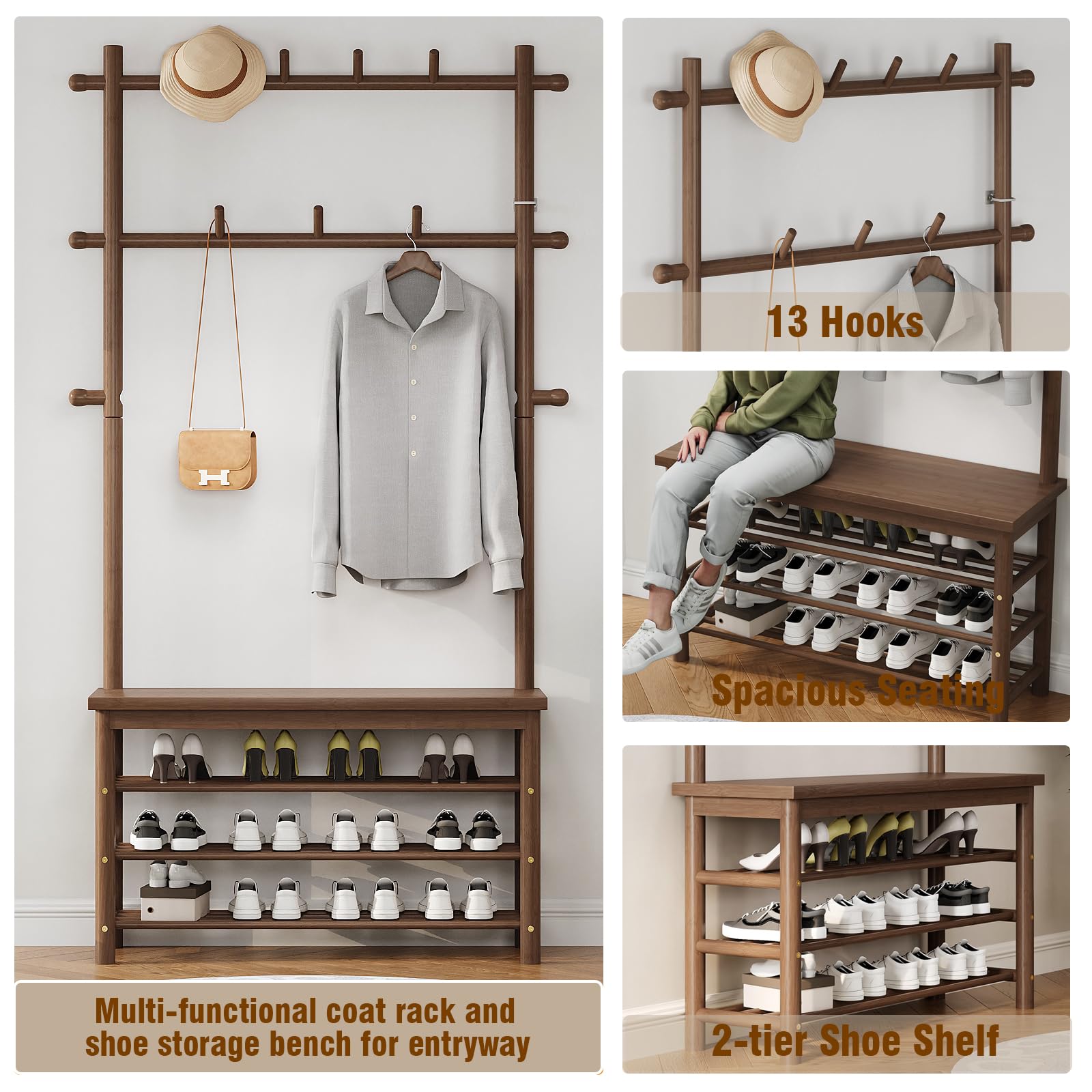 Welfuturer Bamboo Hall Tree with 13 Hook, 6-in-1 Entryway Bench with Coat Rack Freestanding, Coat Rack with Shoe Storage Bench Organizer for Mudroom, Bedroom, All-in-One Shoe Rack,Walnut