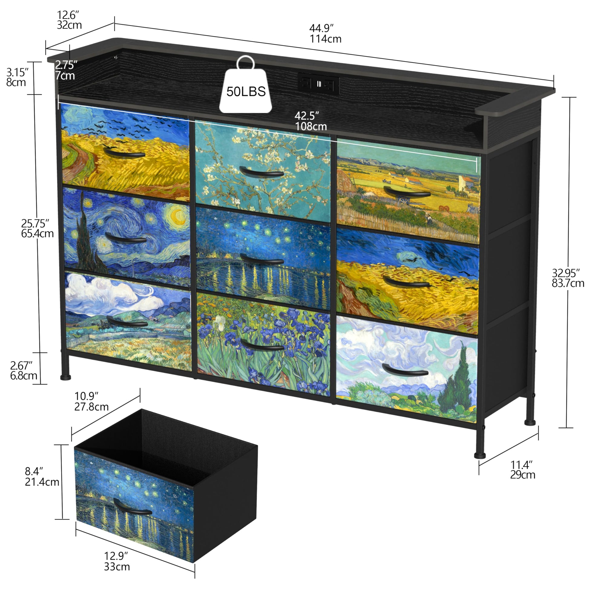Welfuturer Dresser for Bedroom with 9 Drawers Van Gogh Dressers & Chest of Drawers Fabric Clothes Drawer Fabric Closet Organizer for Living Room Entryway Closet Nursery Sturdy Steel Frame Wood Top