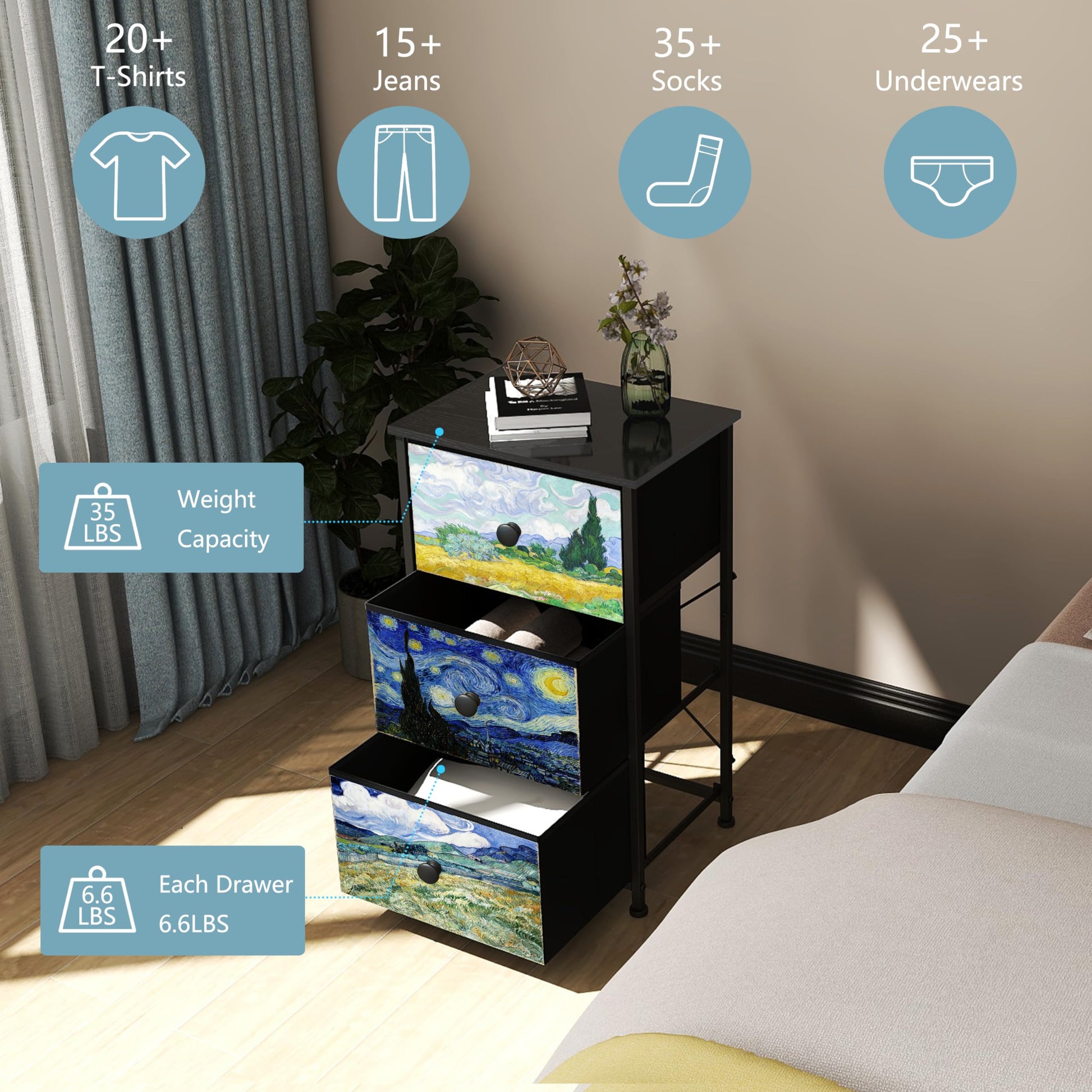 - Van Gogh Pattern Fabric Drawers Dresser: The Van Gogh Pattern on each drawer make it an eye-catching piece of furniture that will surely attract attention in any room. It adds charm and elegance color to your room. This Nightstand is ideal for bedroom, living room, closets, entryways, etc