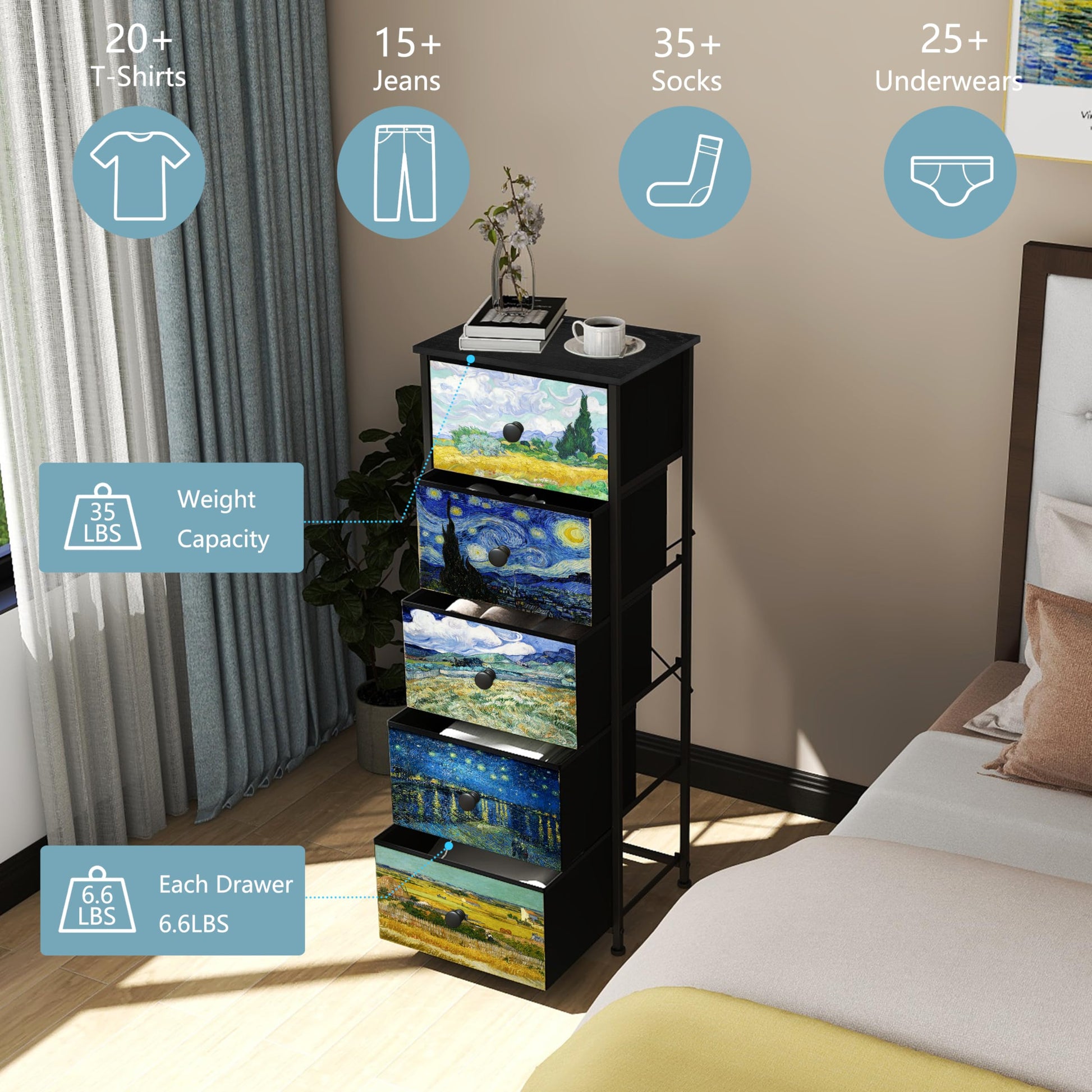 - Van Gogh Pattern Fabric Drawers Dresser: The Van Gogh Pattern on each drawer make it an eye-catching piece of furniture that will surely attract attention in any room. It adds charm and elegance color to your room. This Nightstand is ideal for bedroom, living room, closets, entryways, etc