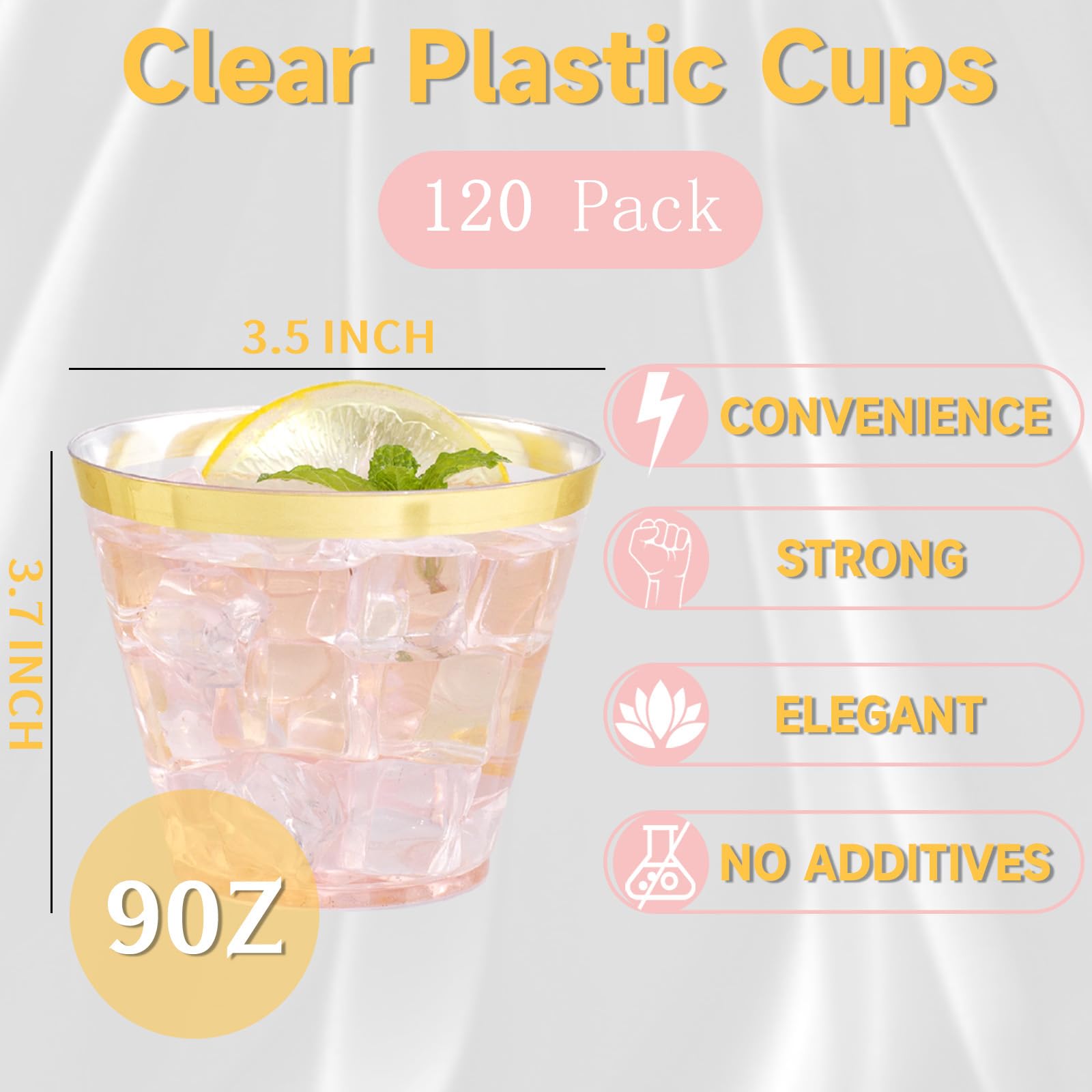WELLIFE 120 PCS Gold Plastic Cups,9 oz Clear Plastic Cups,Disposable Wine Glasses,Disposable cups for Party and Wedding