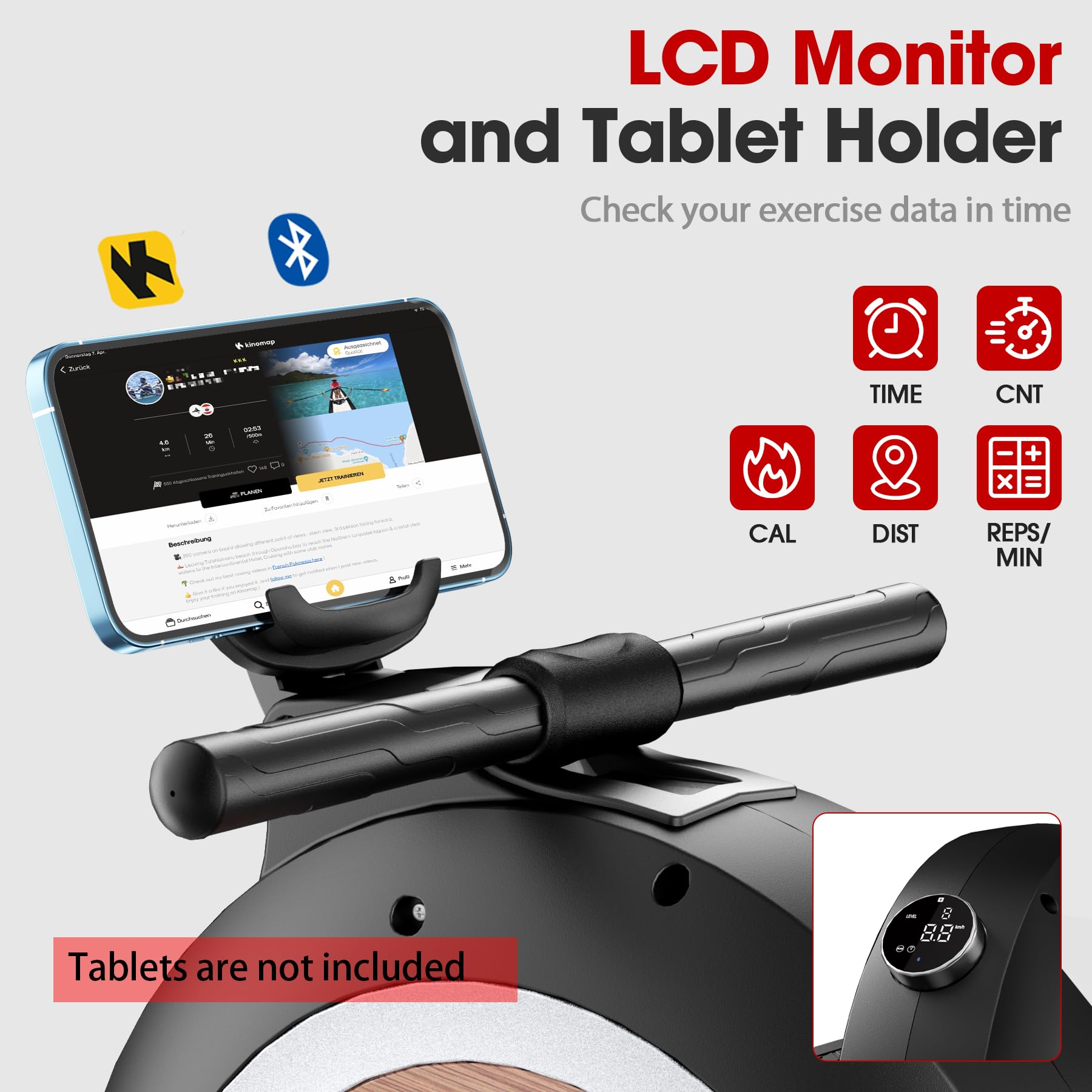 - [Smart Electronic Control & Fitness Tracking] The rowing machine is equipped with an intelligent electronic resistance knob, allowing you to easily adjust the resistance level anytime. Track your exercise data in real time through the LCD resistance knob display, showing Time, SPM, Distance, Speed, Calories and Stroke Count. It lets you truly enjoy the sport and fully immerse yourself in the experience.
