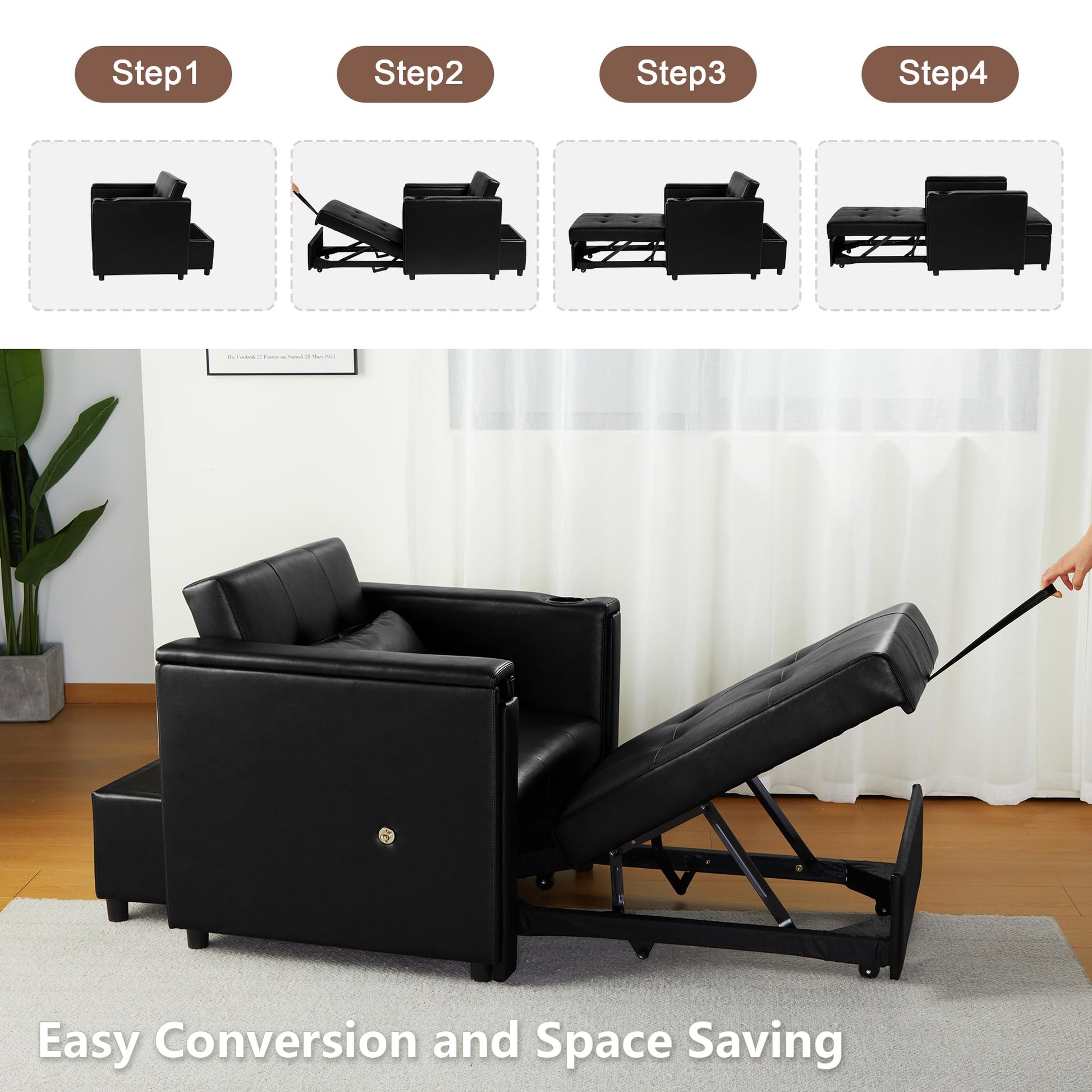 weselon Leather Convertible Chair Bed, 3 in 1 Multi-Functional Lounge Chair Sleeper, Pull Out Couch Guest Bed with Hidden Table and Adjustable Backrest for Living Room (Black)