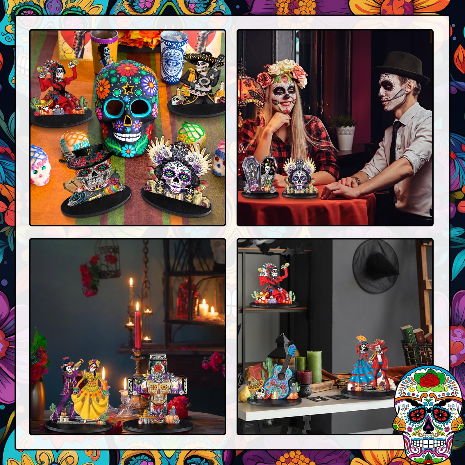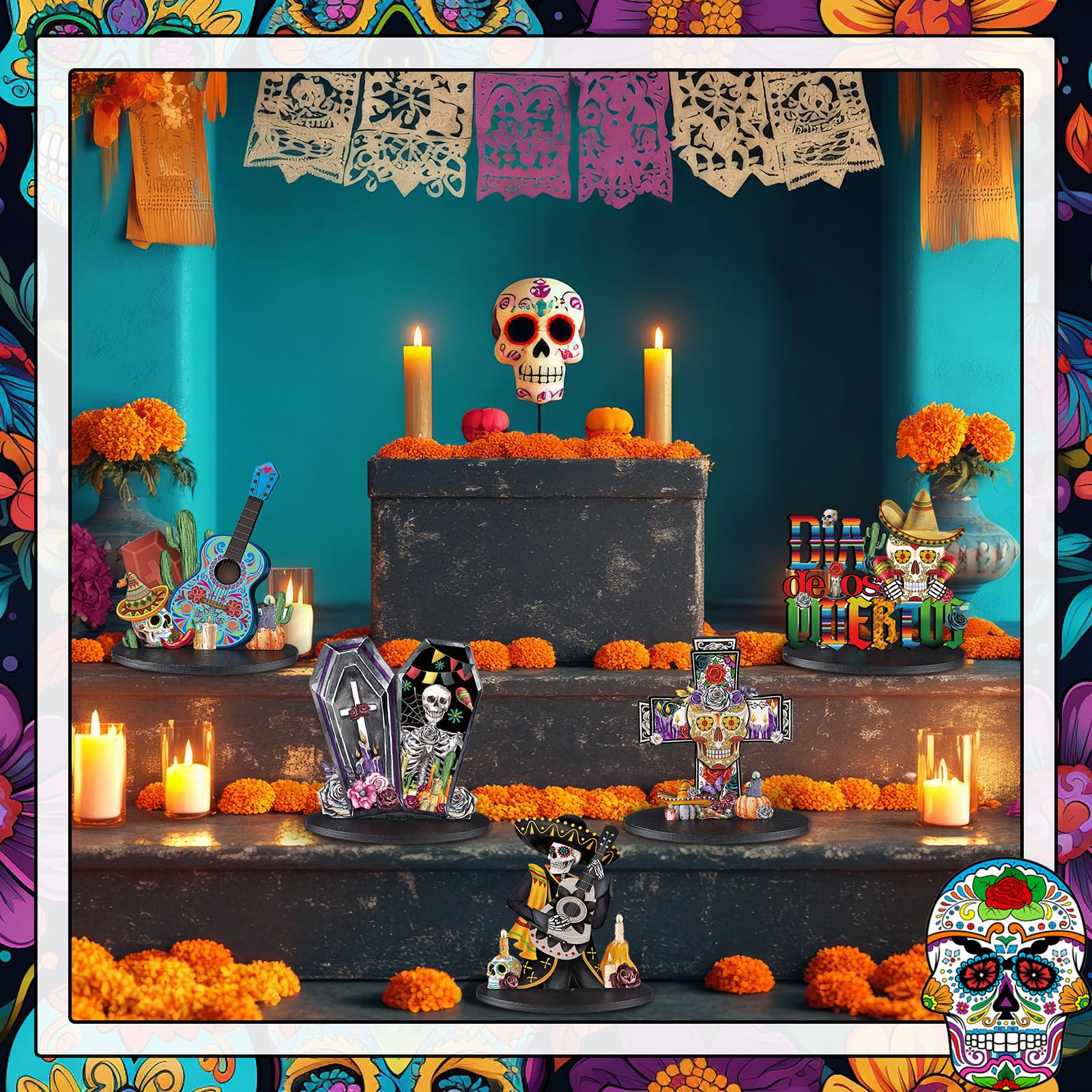 - Complete 12pcs Set for Unforgettable Displays: transform your space with our Day of the Dead wooden table decor; This 12 piece comprehensive series meets all your holiday needs, featuring wooden figurines with black stands; Each piece highlights guitars, and sugar skull designs; Suitable for creating stunning tiered altar displays or table runners, this set elevates any Dia De Los Muertos party decorations or Day of the Dead table centerpiece