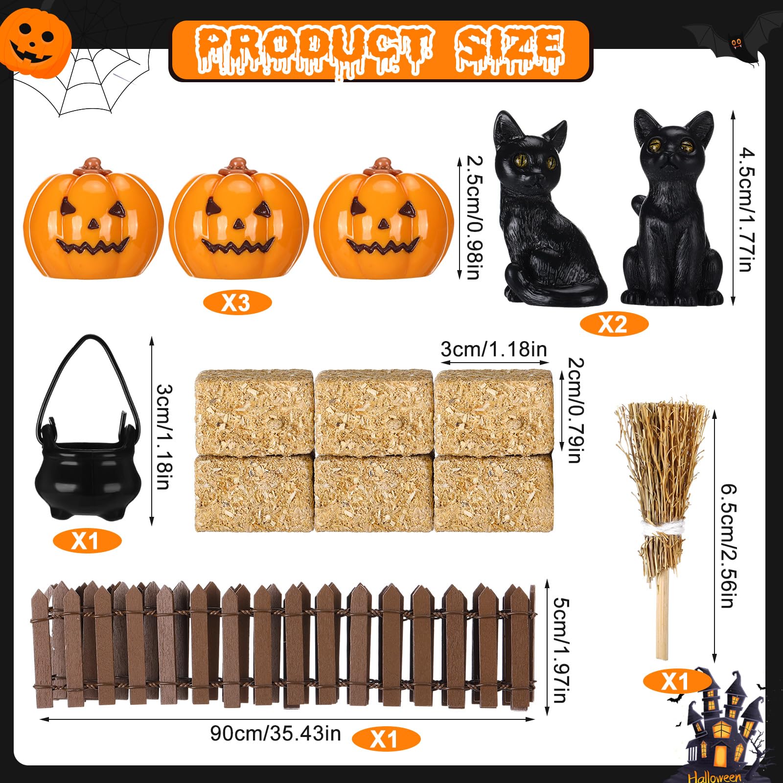 - Perfectly Sized Halloween Charm: this halloween village set offers various sized items, from the 0.8-inch haystacks to the 2.6-inch broom, and an elaborate 35.4-inch fence; These small Halloween figurines are ideal for any space, making them suitable Halloween village figurines for capturing the festival's essence