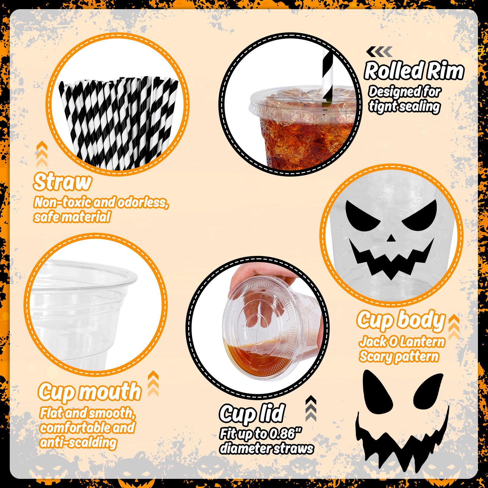 - Jack-O-Lantern Design - Our clear cups with lids and straws are printed with black Jack-O-Lantern expressions, 6 designs in total, spooky and eye-catching, matching straws are in the same color design, suitable for many occasions.