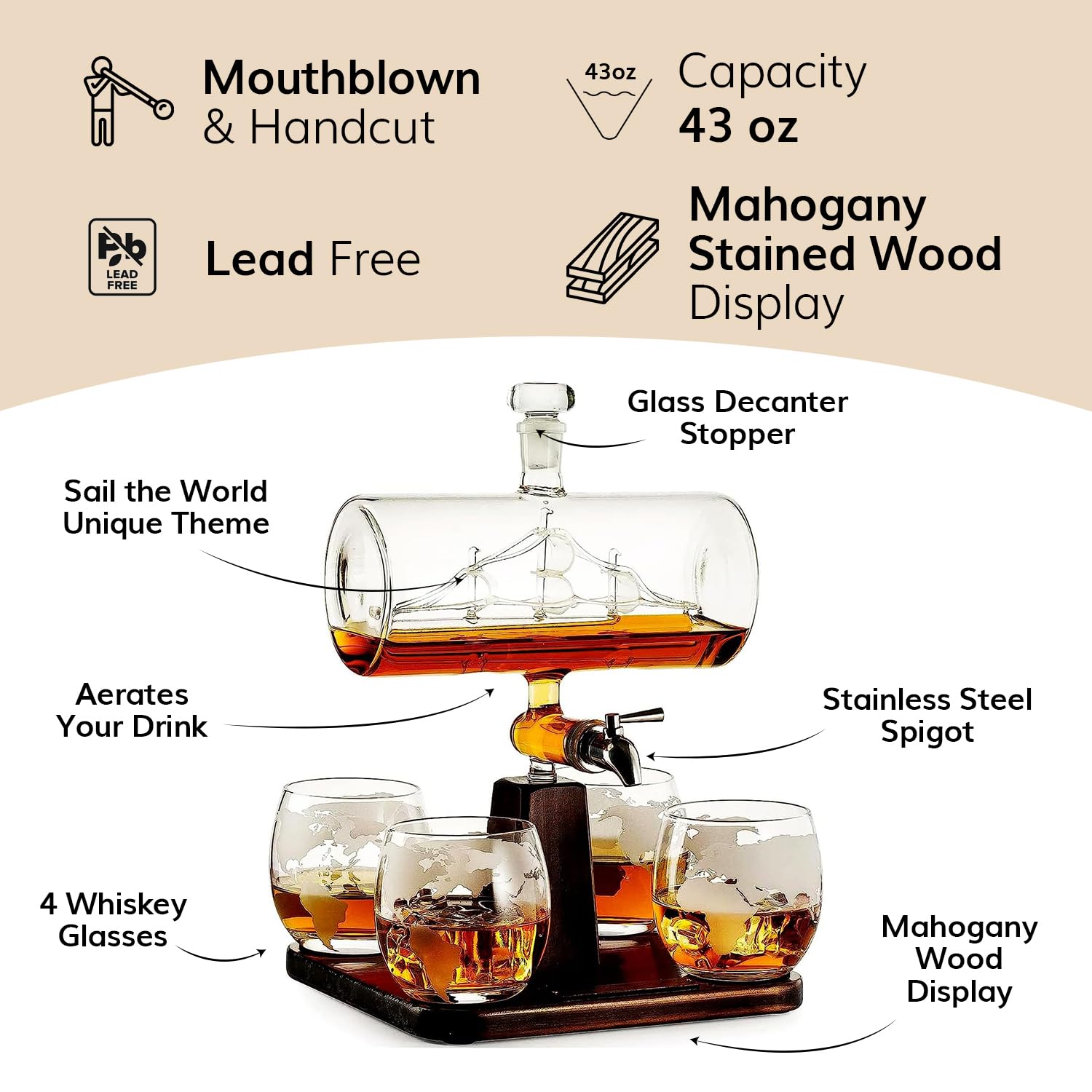 Whiskey Decanter Globe Set with 4 Etched Whiskey Glasses - for Liquor Scotch Bourbon Vodka, Gifts For Men - 1250ml Unique Ship Sails Set for Home Bar, Bourbon, Birthday Gift for Dad