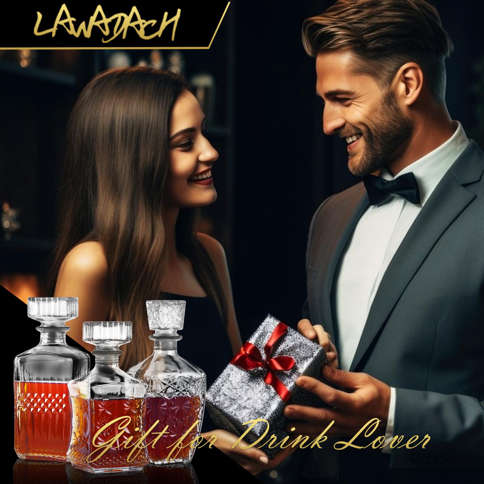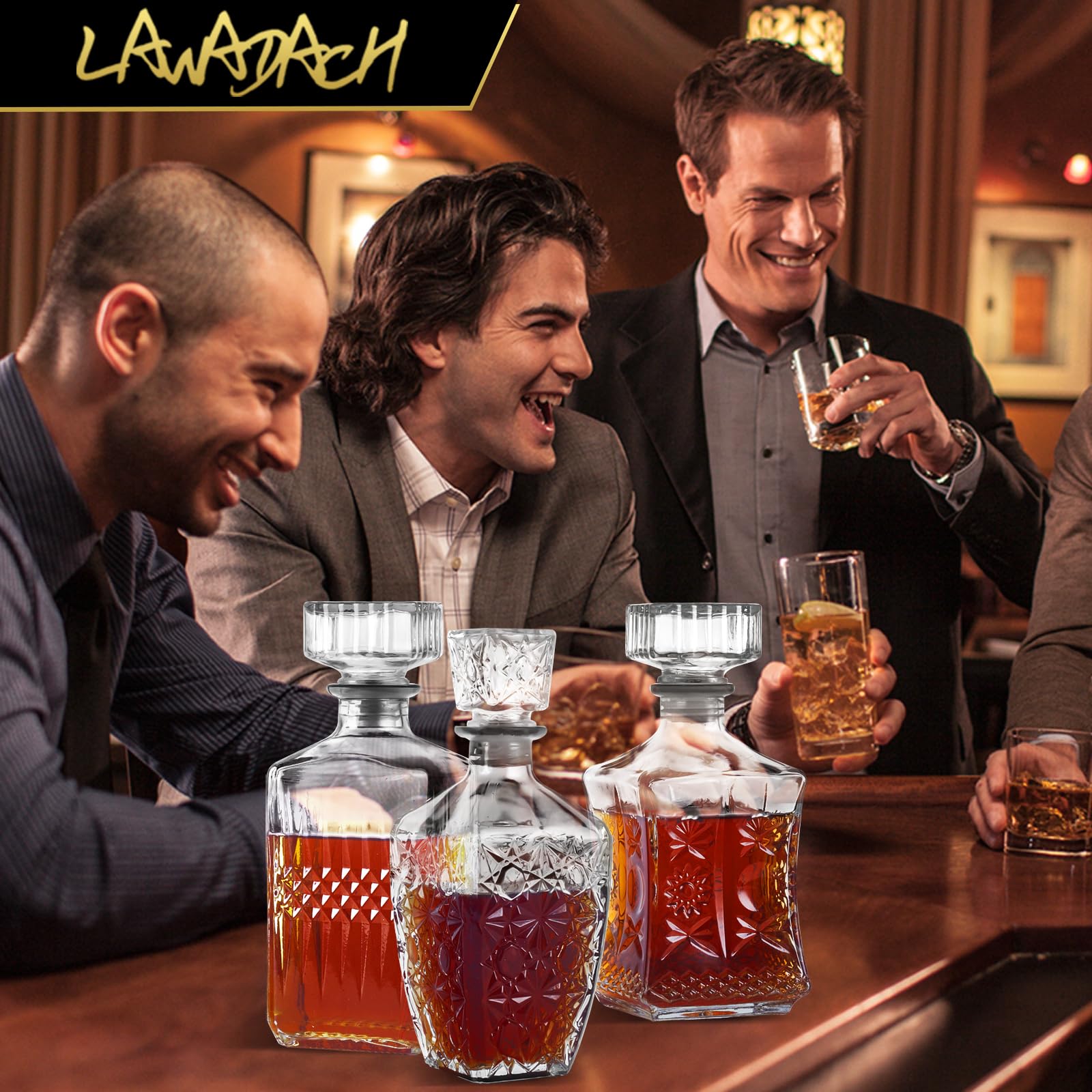 - [3 Different Design] - LAWADACH liquor decanter set consist of one 31oz and two 28oz glass bottles with different pattern.They are the ideal size for storing your favorite spirits, such as whiskey, tequila, brandy, scotch and so on