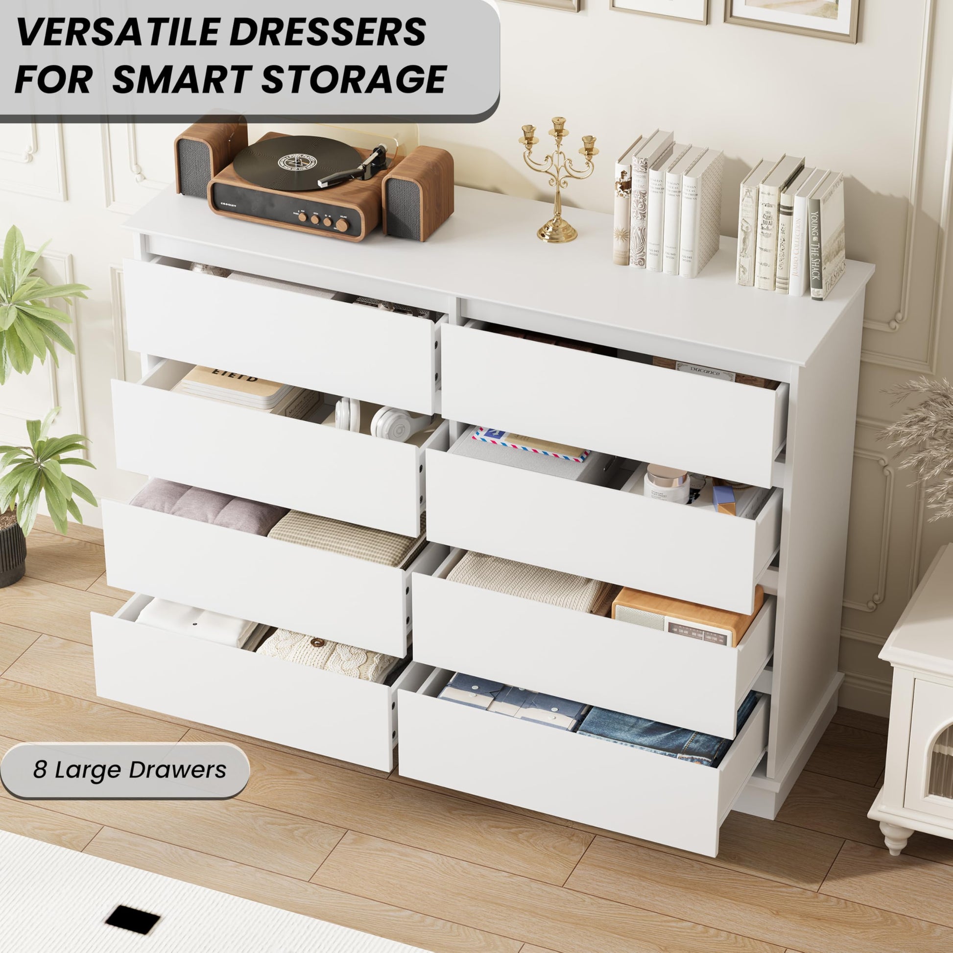 White 8 Drawer Dressers for Bedroom, Chest of Drawers with Deep Drawers, Large Double Dresser for Closet with Wide Top, Horizontal Wooden Dresser for Living Room, Hallway, Kids Room