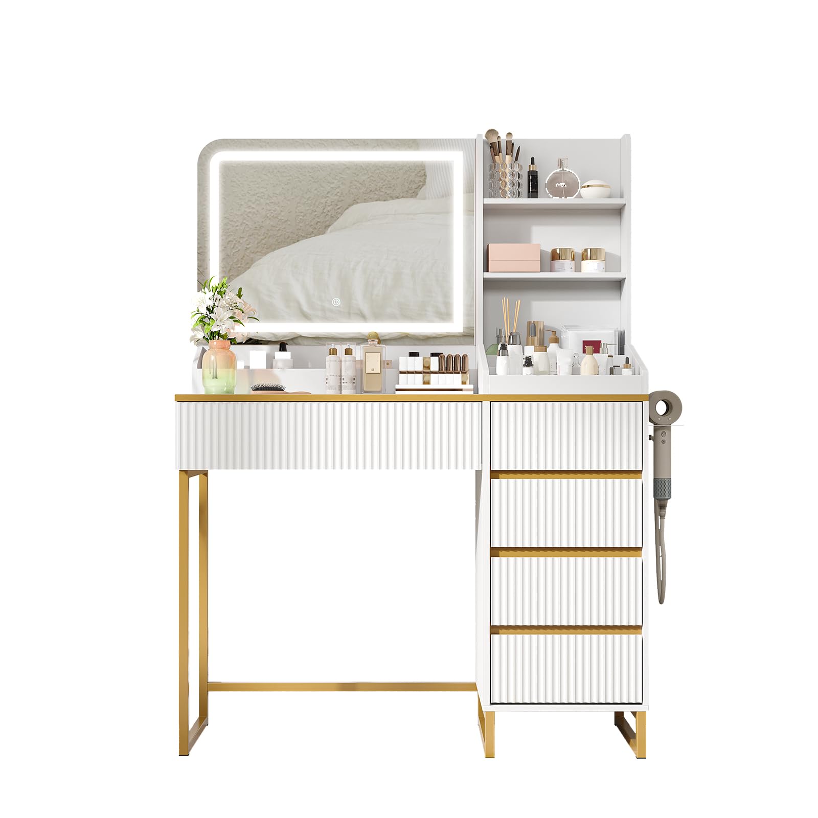 - Elegant White & Gold Design: This vanity table combines a pristine white finish with luxurious gold accents, offering a chic and timeless aesthetic that complements any bedroom decor.
