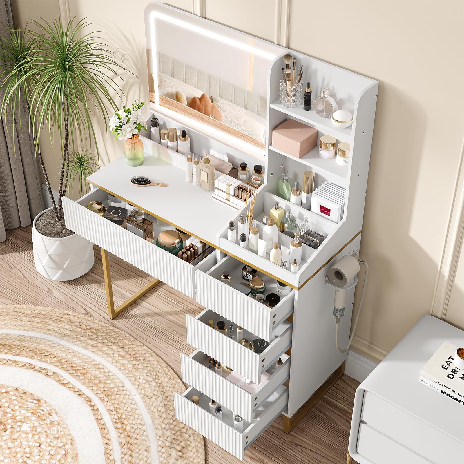 White and Gold Vanity Desk with Mirror and Lights Makeup Vanity with 5 Drawers and Charging Station, Vanity Table for Bedroom