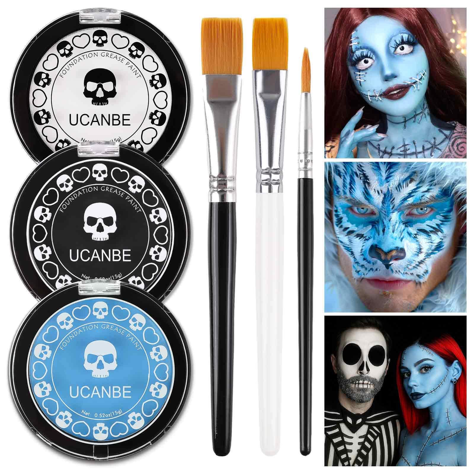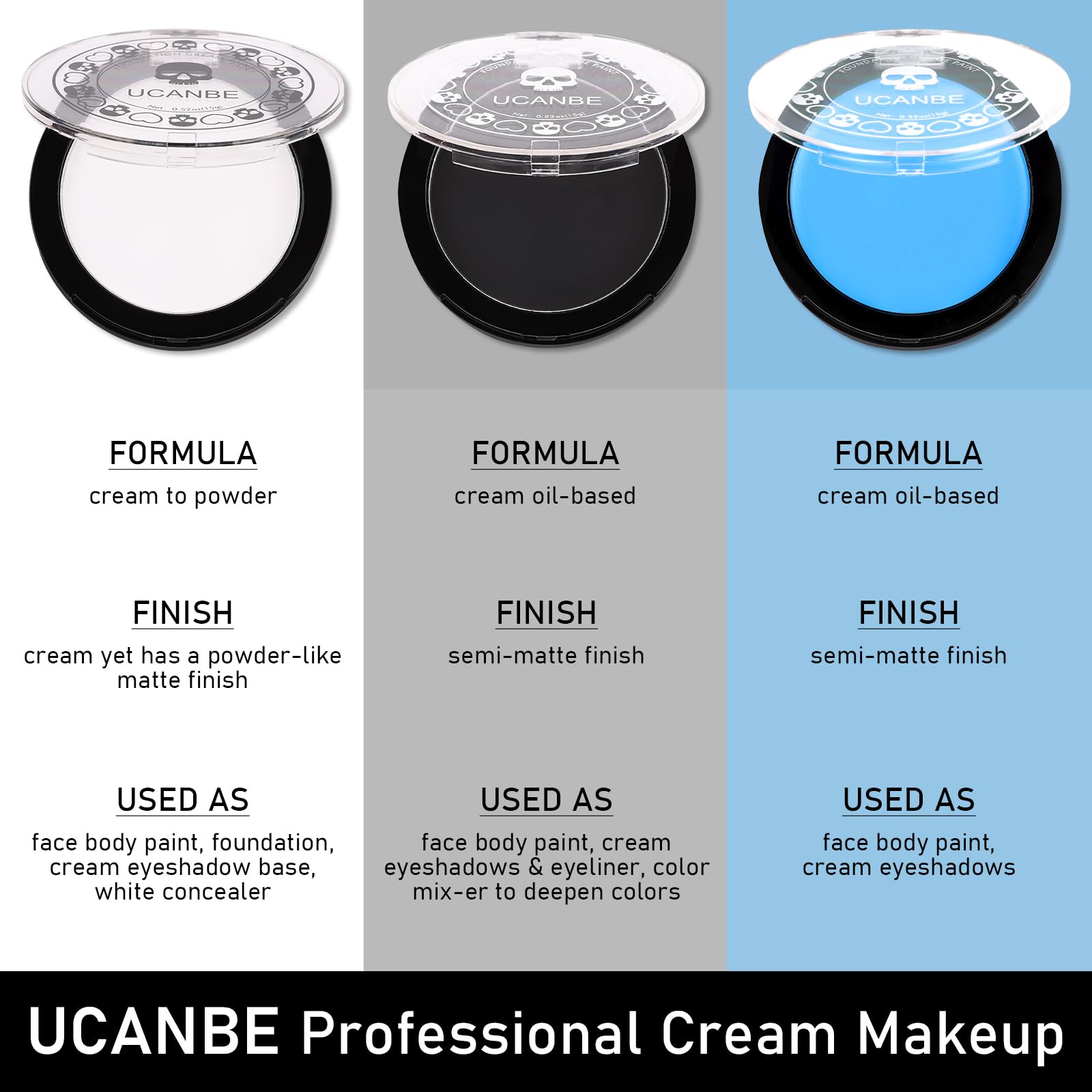- 【White-Black-Light Blue Face Body Paint Cream Makeup for Daily & Halloween】UCANBE face paint kit contains 3 colors professional face paints with 3pcs painting brushes. The white foundation face makeup paint is specially crafted with cream-to-powder formula that glides on like cream yet settles down to a matte finish. The black and light blue face paints, with silky texture, are oil-based cream makeup paints that goes on smoothly and easy to blend and layer for flawless opaque makeup. UCANBE White Pressed Setting Powder is highly recommended to set makeup quickly and last all day long