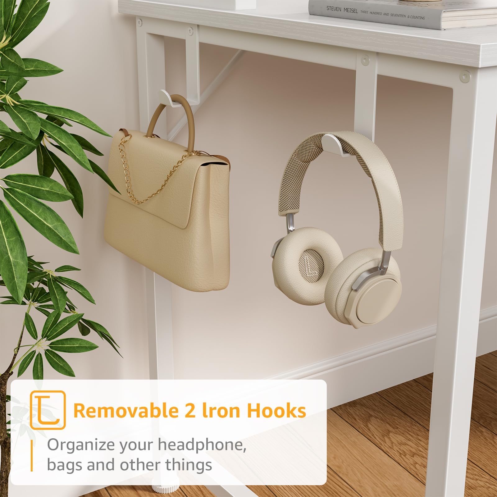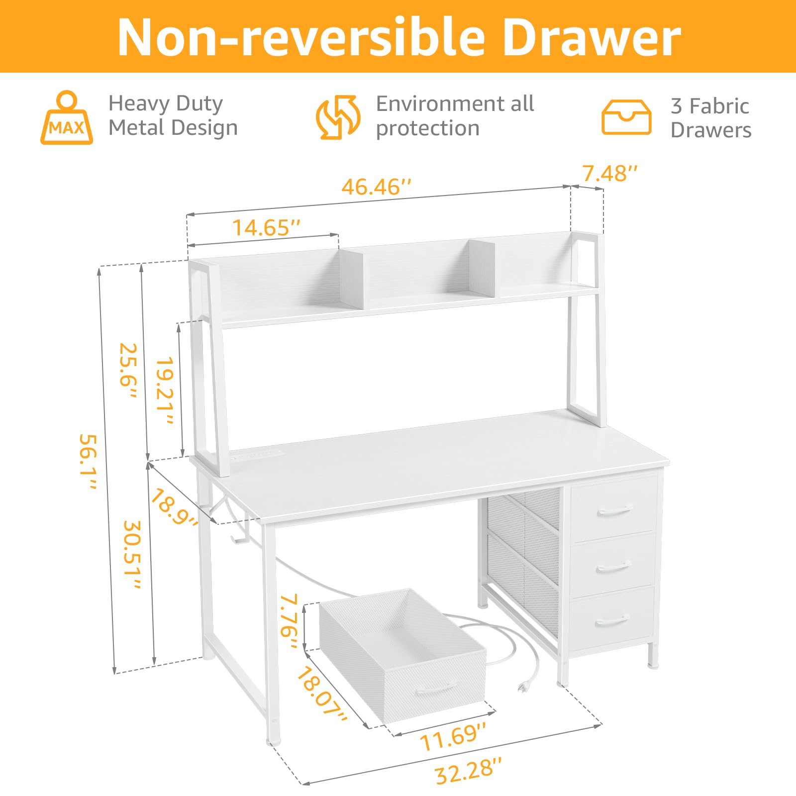 Details: Dlisiting 47 Inch White Computer Desk with Hutch and Drawers, Office Study Writing Desk with Power Outlets, White