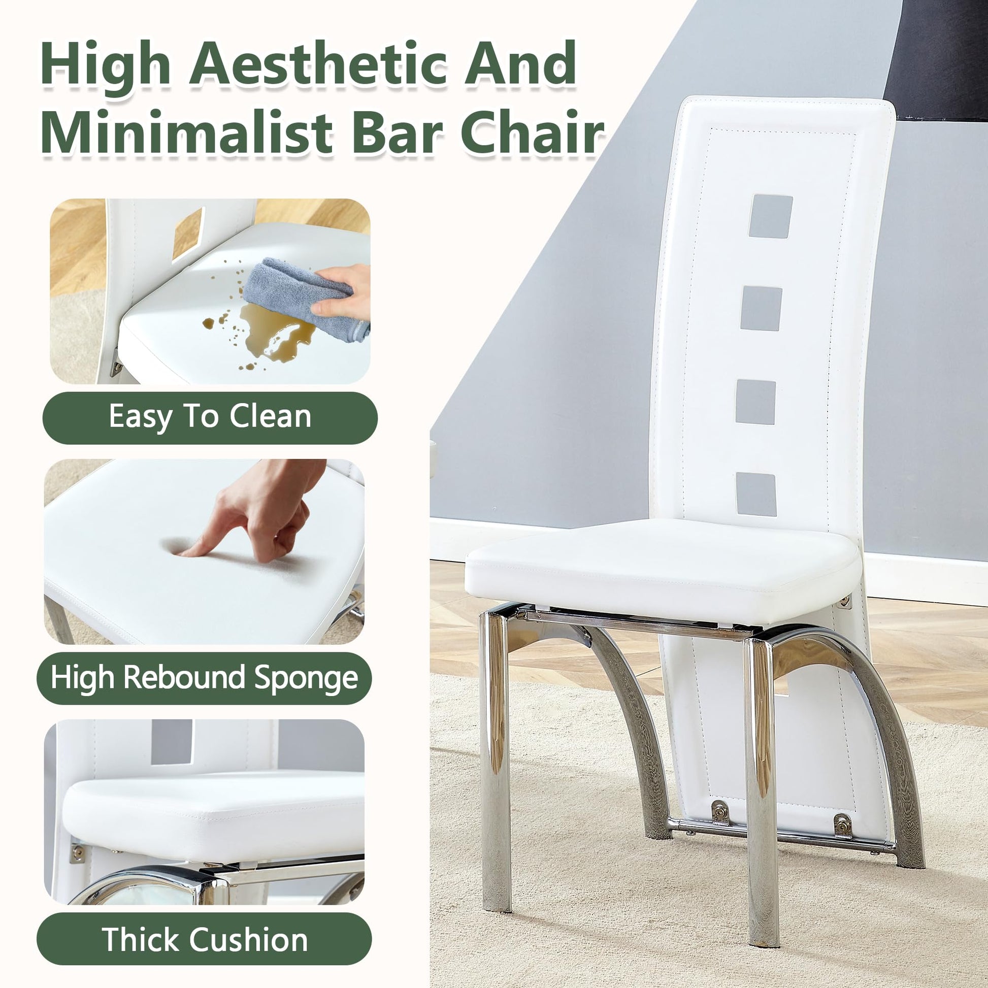 White Dining Chairs Set of 4, Modern Dining Room Chairs Set of 4, Upholstered PU Leather Kitchen Chairs with Silver Metal Legs, High Backrest Armless Seating for Kitchen, Dining Room