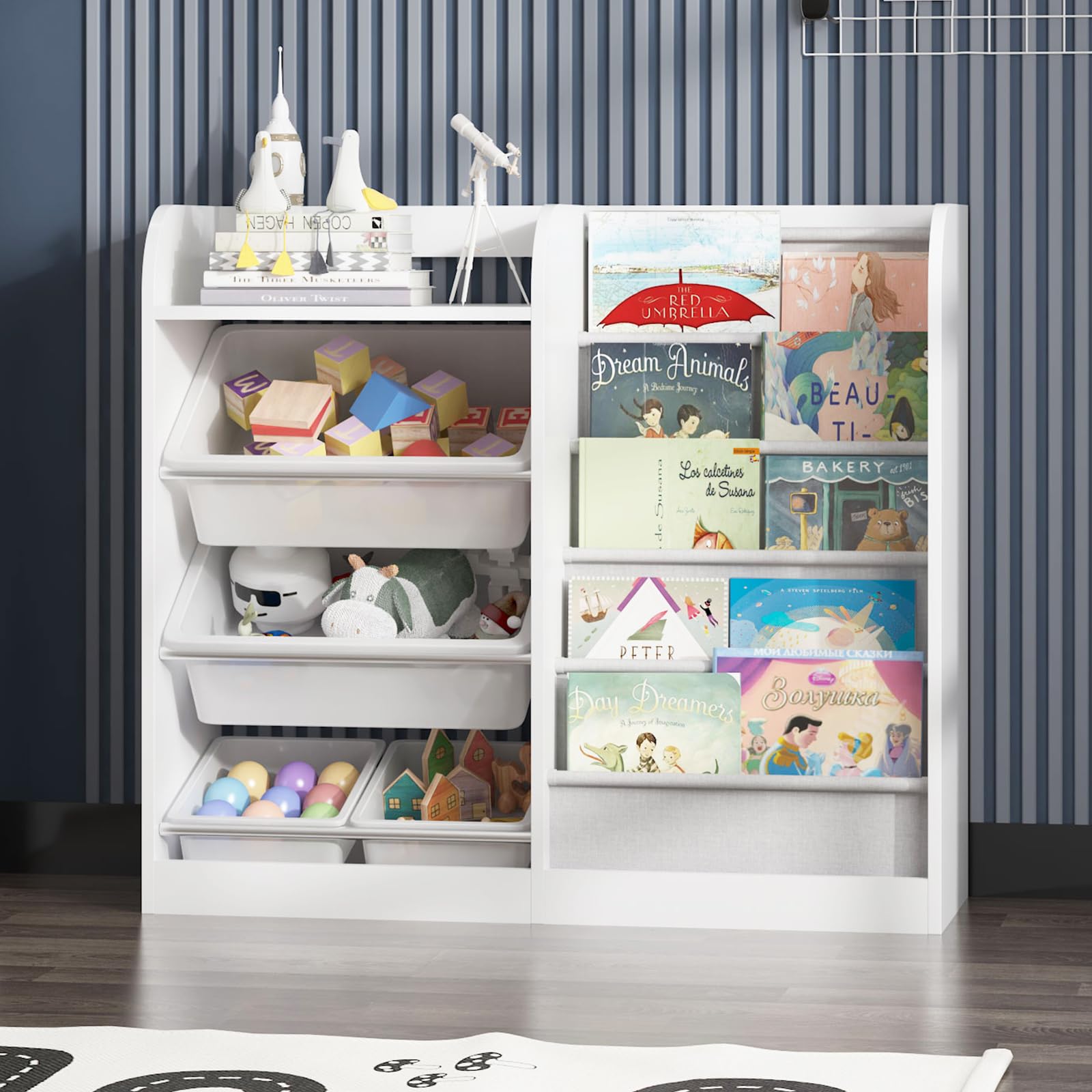 - Toddler-sized Kids Bookshelf: This 2-IN-1 toy storage organizer integrates plastic storage organizer bins with a kids' bookshelf into one versatile unit. This baby bookshelf with 5 sling pockets displays books with covers facing forward for kids to identify and retrieve their favorite books easily and quickly. Those 5 deep cotton linen storage pockets can store different sizes and shapes of reading books, board books, coloring books and magazines.