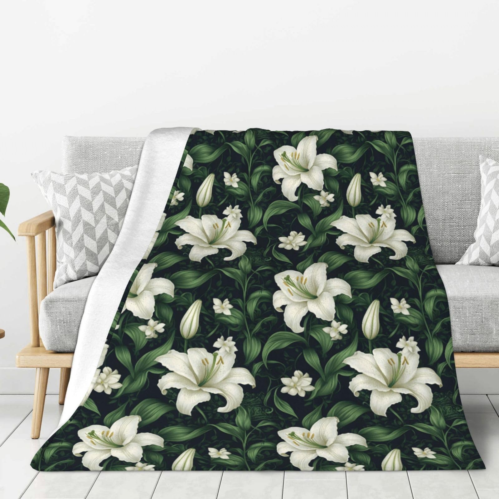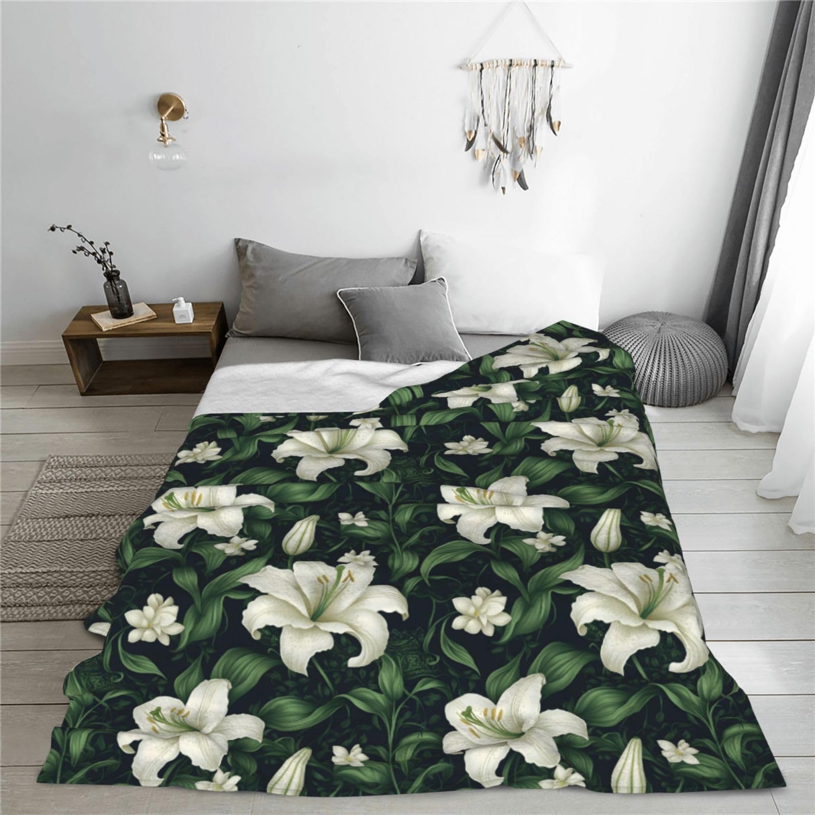 White Lily Leaves Print Throw Blanket for Couch Sofa Bed, Super Soft Lightweight Cozy Fuzzy Warm Flannel Plush Throw Blanket 80"x60" - All Season Use