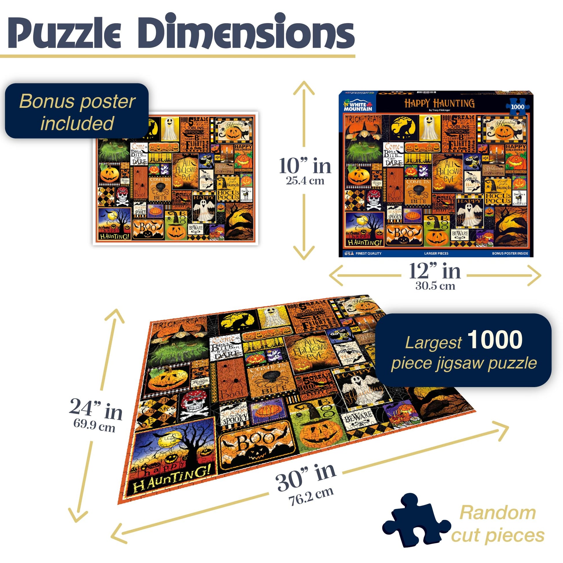 - HALLOWEEN DELIGHT: Get into the spooky spirit with our 1000 piece jigsaw White Mountain puzzle, "Happy Haunting," featuring a vibrant array of orange-themed Halloween images and quotes for a bewitching puzzling experience.