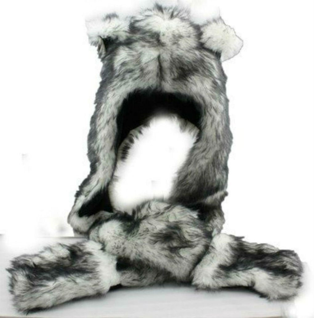 White Wolf Hood Faux Fur Hat with scarfs mittens & paws 3 in 1 by Hatbutik