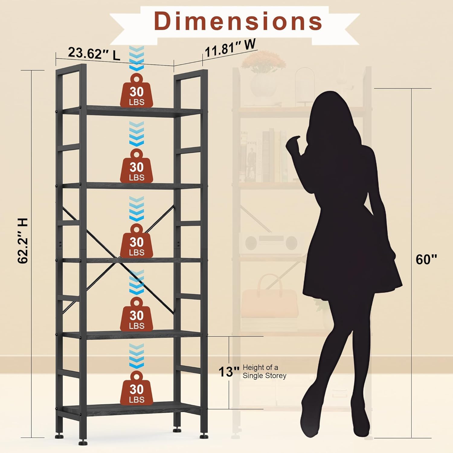 - 【Space-Saving 5-Tier Vertical Storage】 Maximize tight spaces with this 11.81"D x 23.62"W x 62.2"H tall corner bookshelf! 5-tier vertical design creates ample storage without wasting floor area—perfect for organizing books, CDs, movies, garage tools, or potted plants. Ideal for small rooms needing smart, vertical storage.