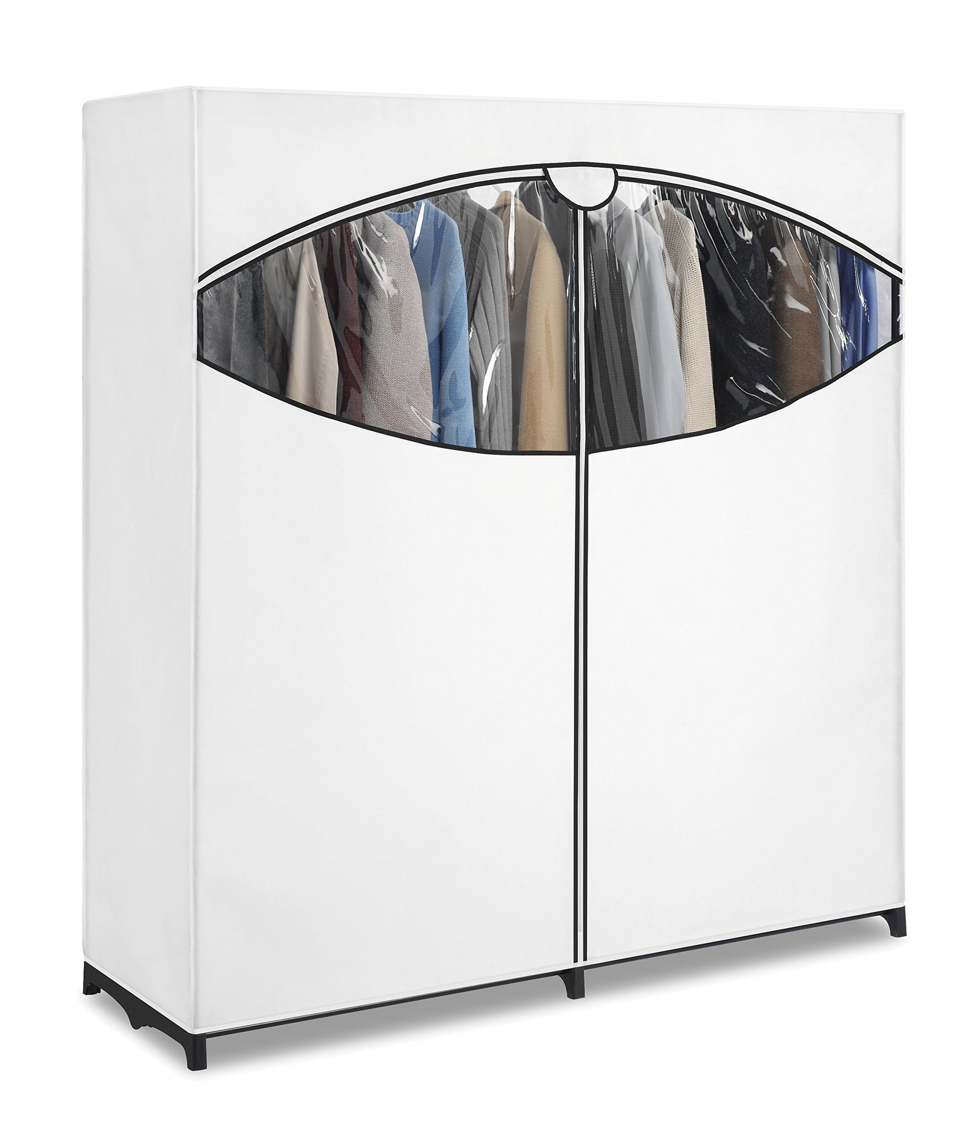 Whitmor's perfect solution for your clothes storage needs. This new and improved 60-Inch extra wide stand alone clothes closet has a sturdy heavy-duty zippered front for convenient, trouble-free access. New easy assembly uses a durable bungee cord system and improved, sturdier plastic connectors. Heavier weight white polypro cover has added blue trim and a larger clear window to view contents in closet. More clothes can be stored because of added wired support for the 60-Inch closet rod. Assembled size: 19-1/2-Inch W by 60-Inch L by 64-Inch H.