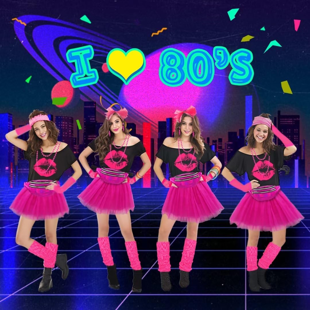 - Package Included 24PCS-T-shirt, tutu skirt, fanny pack, fingerless short fishnet gloves, fingerless long fishnet gloves, leg warmers, neon necklaces, lace headband,flash earrings, silicone bracelets, complete your demands on 80's costume accessories