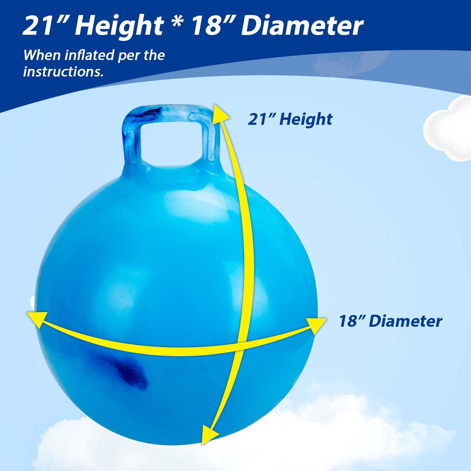 - Great Gifts for Kids - The hopper ball is 18in in diameter and a great toys for ages 3-10. Great gift for birthday, Children's Day, Christmas, summer camp activities, back to school, etc. KINDLY NOTE the hopper ball is 2 pack(Blue and purple)