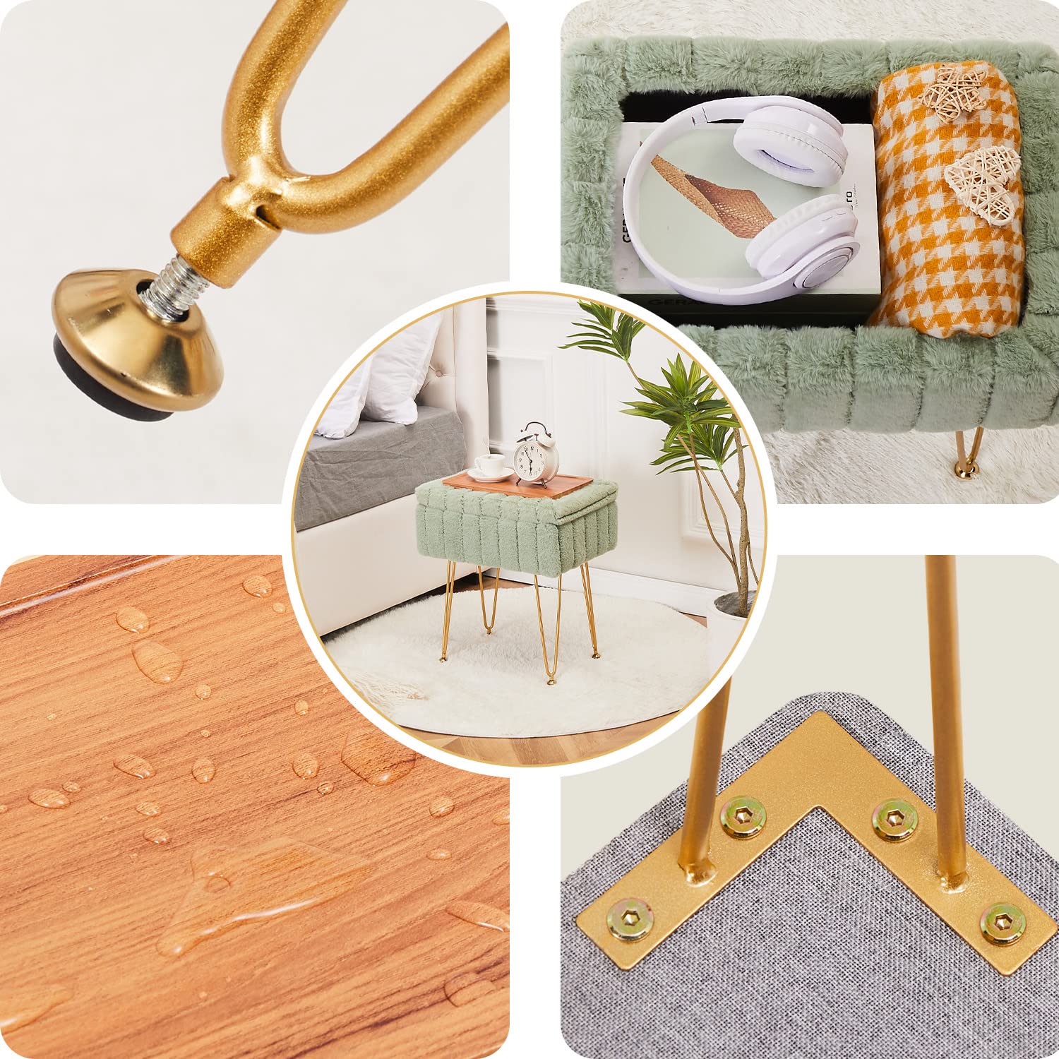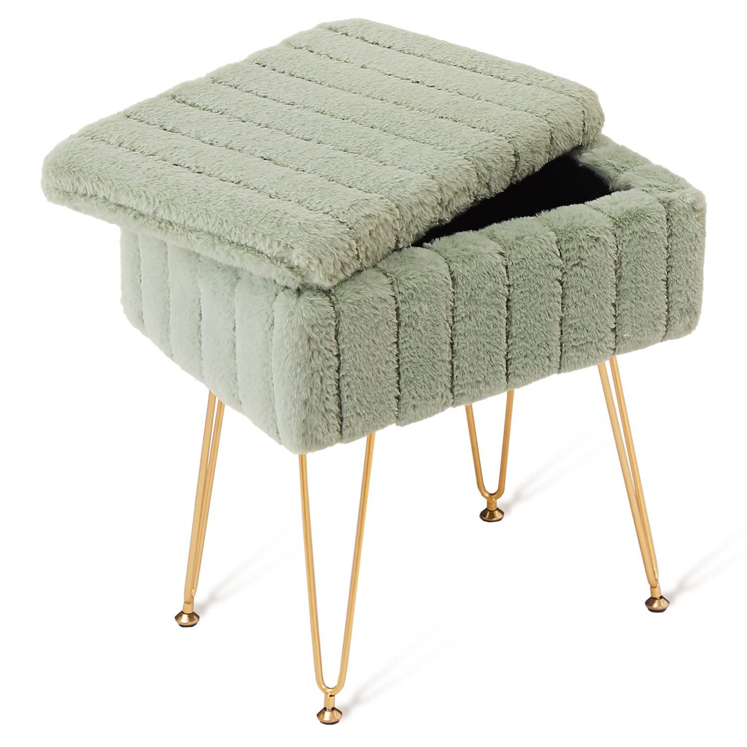 Wimarsbon Faux Mink Fur Storage Ottoman, Modern Soft Footstool, Storage Bench with Metal Legs, Vanity Seat, Fur Stool, Ottoman Coffee Table, Makeup Chair, Vanity Stools for Bedroom (Light Green)