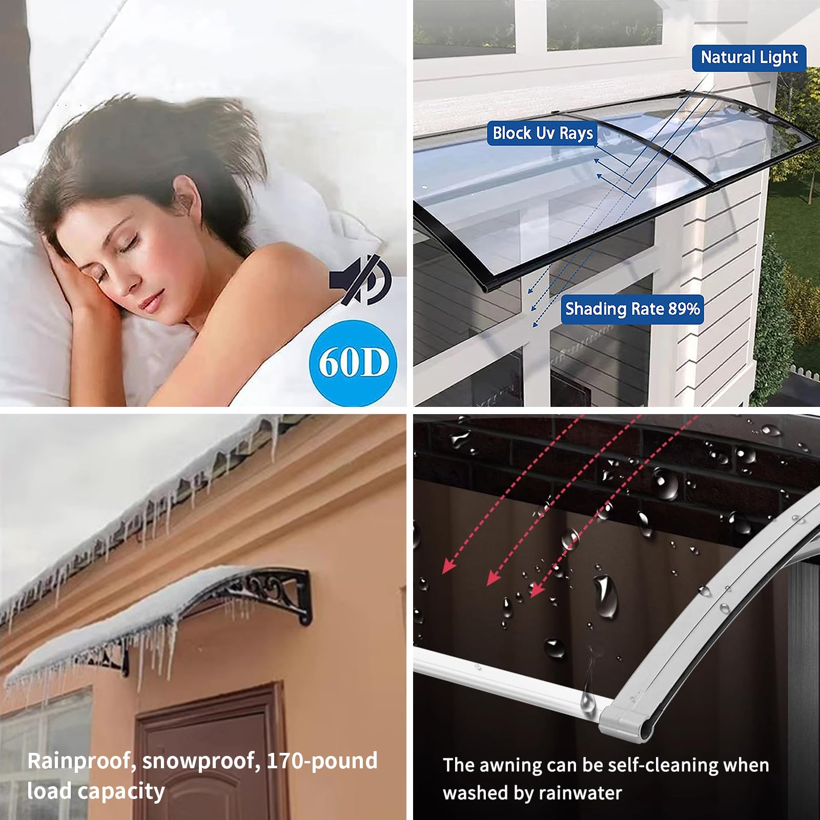 - [Durable and noise-free] Our arched awnings are made of 2.5mm/0.1inch transparent polycarbonate panels, Plastic steel bracket, making them shock-resistant and silent. They can withstand up to 100kg/220lbs of weight and can easily withstand strong winds, heavy rain, and snow, creating a quiet sleeping environment.