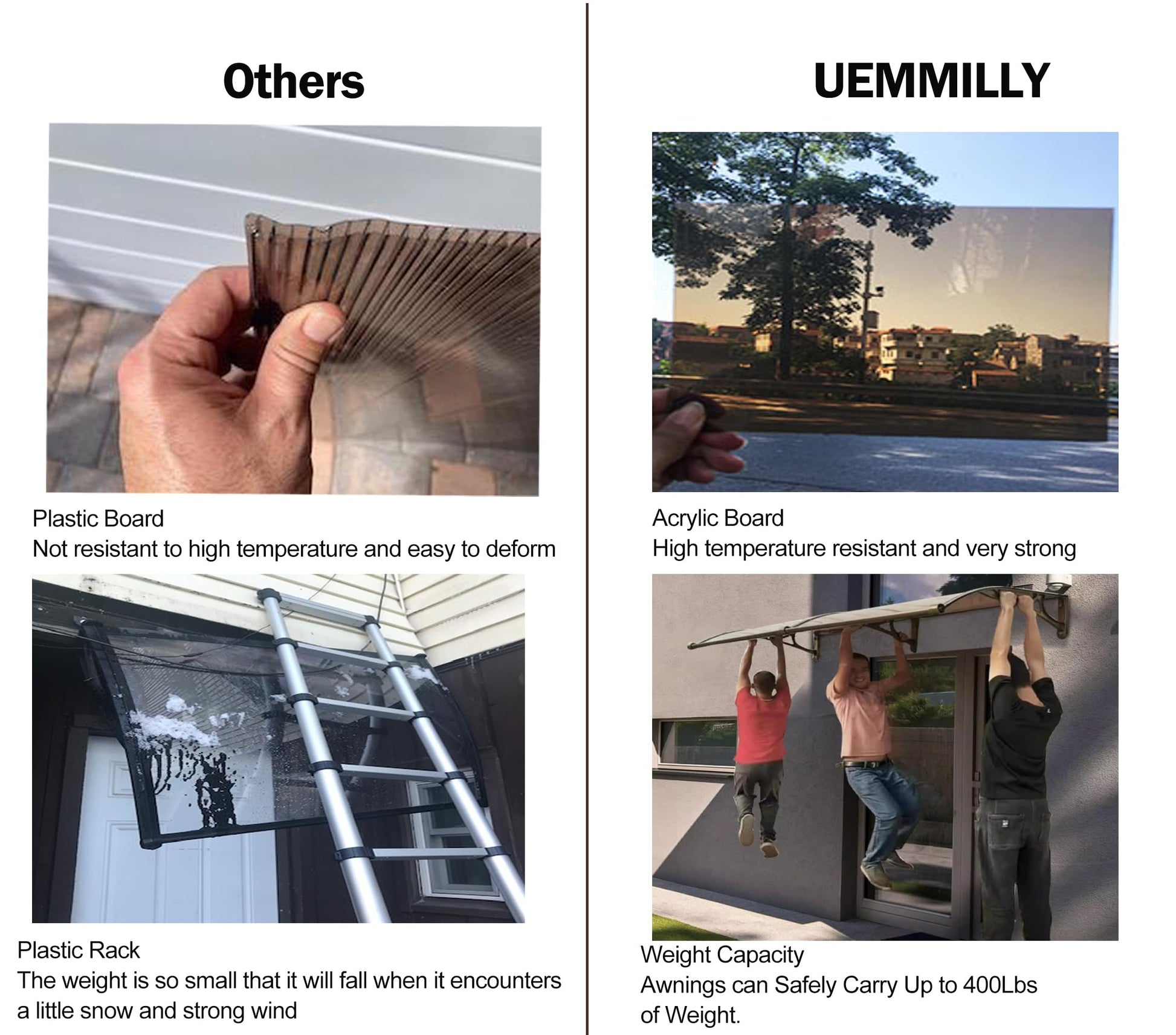 - 【UNIQUEST STRUCTURE】 : UEMMILLY sun visor bracket adopts all-metal design, aluminum alloy can effectively resist corrosion, rust and aging. At the same time, it has a very high load-bearing capacity to protect the visor's firmness and stability. There is a separate drainage sink in front of the visor, so that it can be better discharged and will not flow to front of the visor, no longer wet pedestrians who passing through the visor.