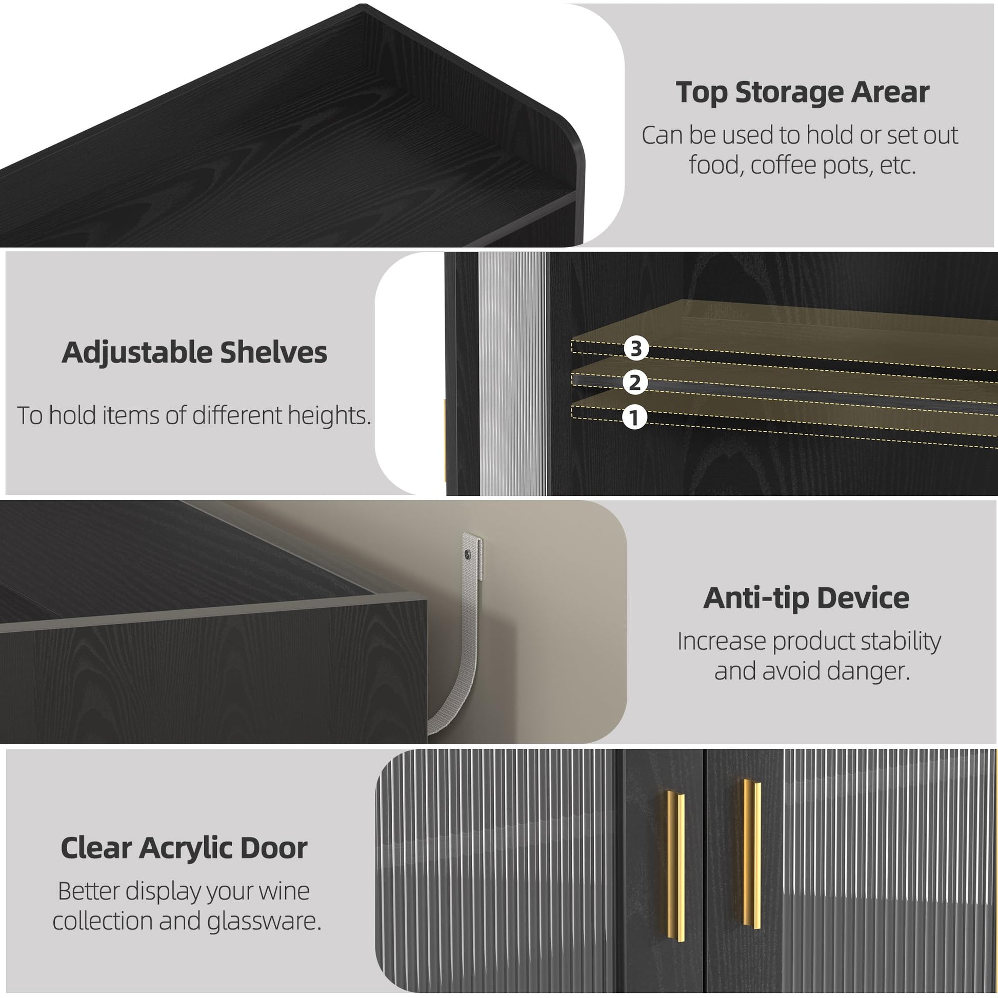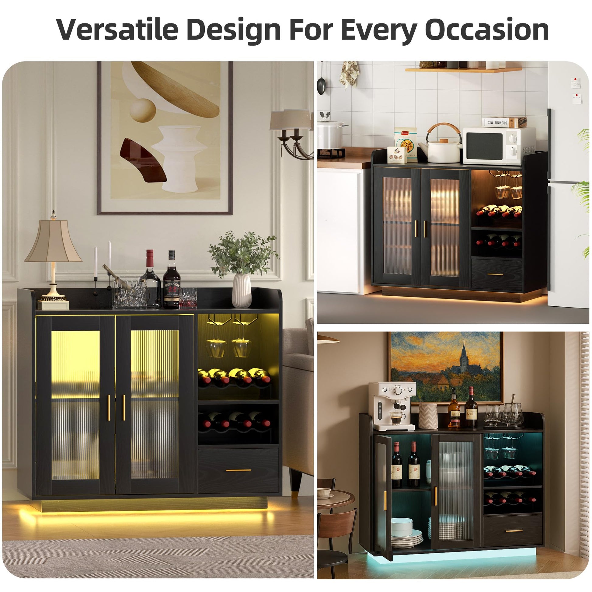 - 【LED Lighting and Fluted Acrylic Doors】Our mini bar was built-in LED lighting and transparent acrylic doors greatly enhance the home atmosphere. Whether hosting a party or enjoying a quiet evening, the glow from the LED lights creates an inviting atmosphere. This liquor cabinet doesn't just store bottle, it's a centerpiece that draws attention and sparks conversations.