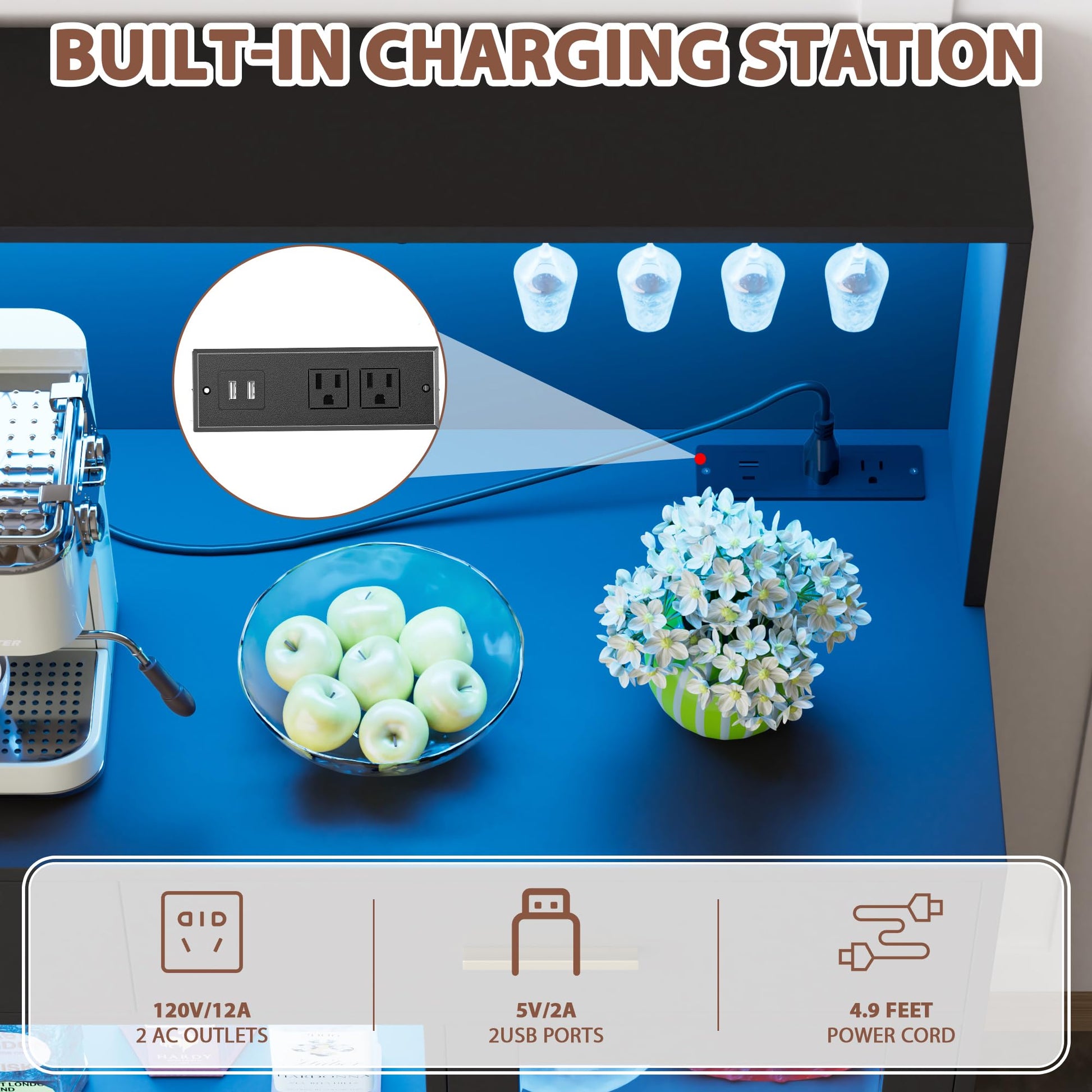 - Home Coffee Bar Cabinet with Power Outlet: Coffee bar cabinet with storage is equipped with a 4.9ft power cord, 2 AC outlets, and 2 USB ports. This home bar cabinet offers a hassle-free charging solution for your coffee maker, microwave, toaster, and even your phone and other electrical appliances.
