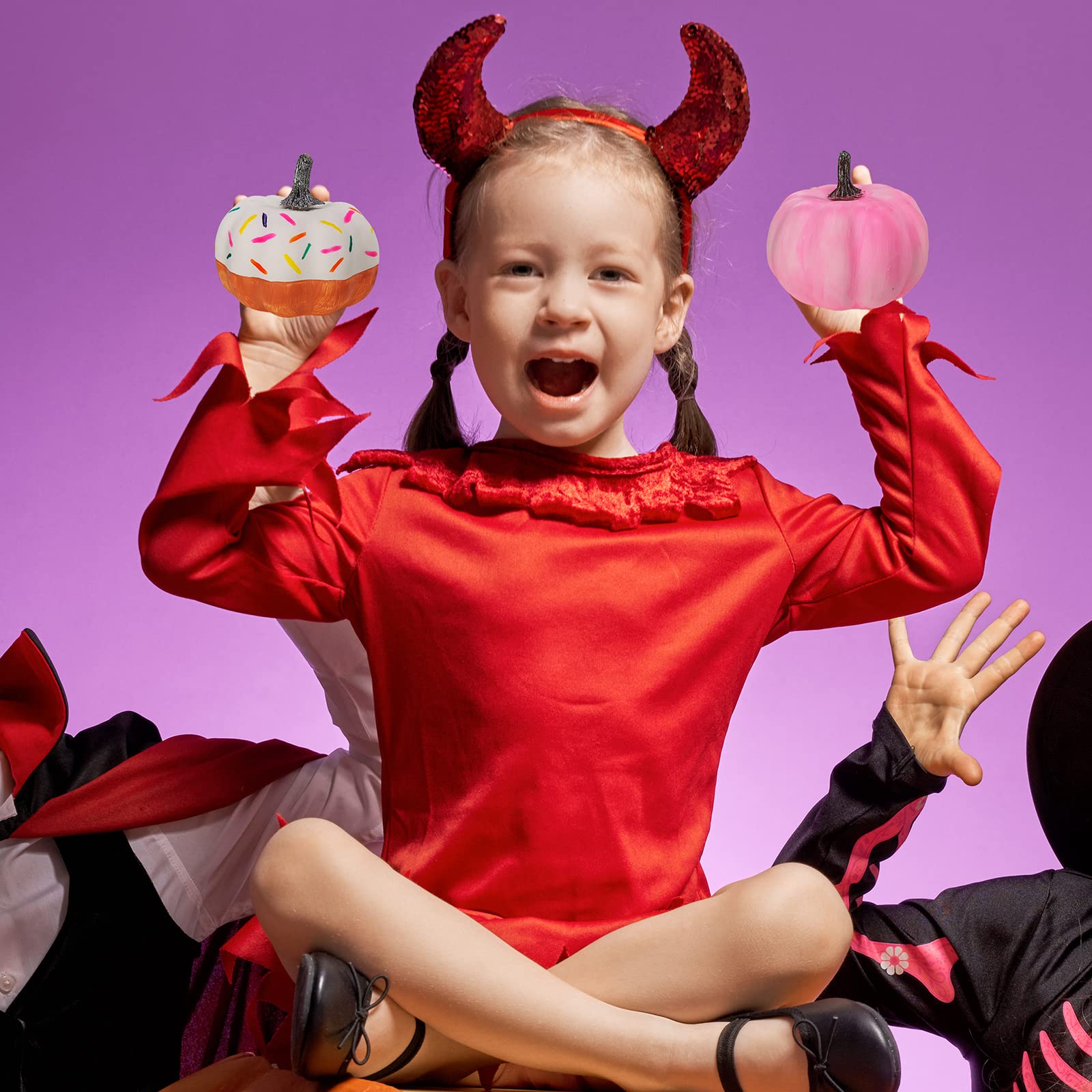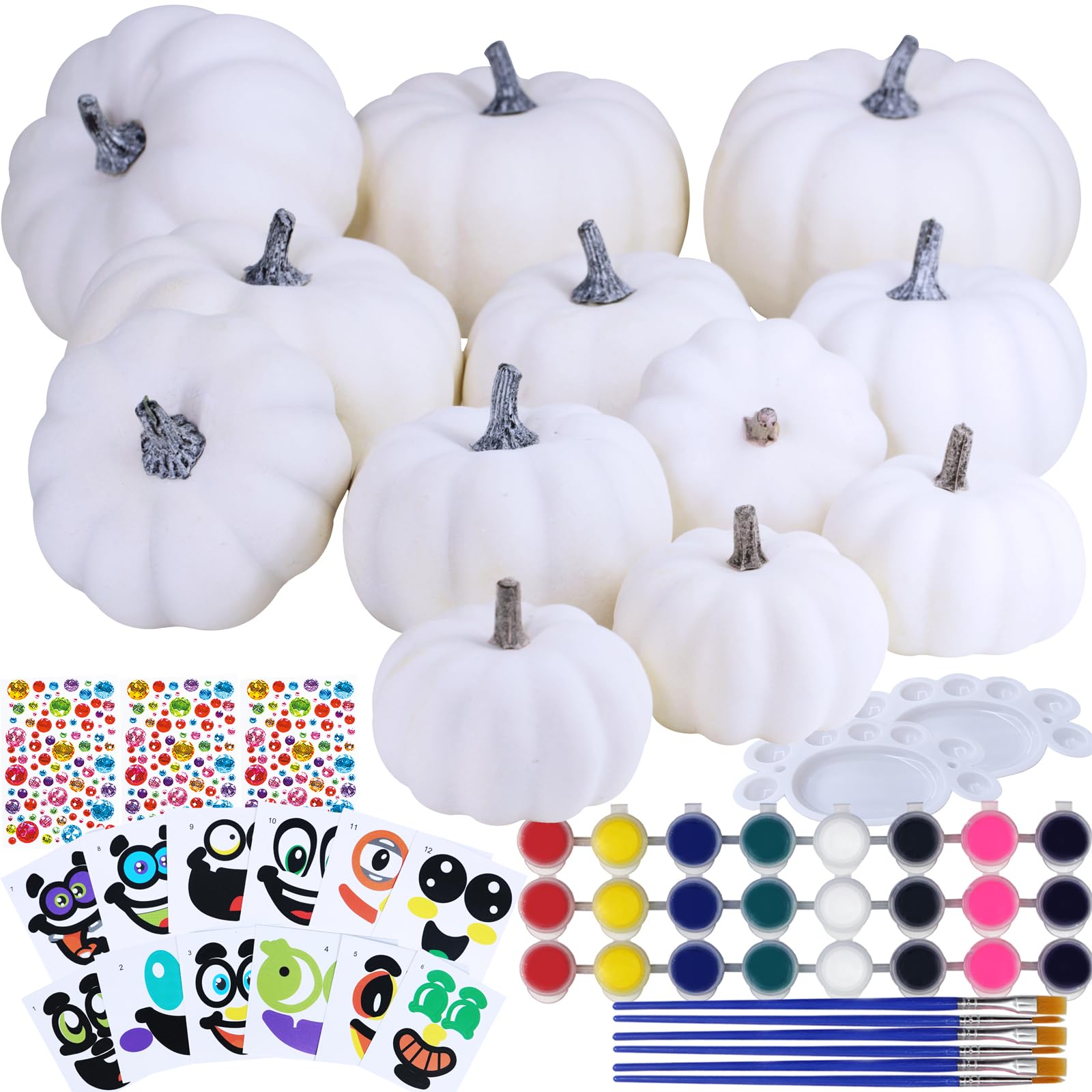 - Quantity: This fall pumpkin painting kit for kids includes 12 pcs small white craft pumpkins to paint, 3 strip of 8-color pumpkin acrylic paint, 6 pcs paint brushes, 3 sheets of rhinestone stickers, 12 pcs Jack-O'-Lantern face stickers and 2 pc palette. The kits give you all the supplies you need to make a set of DIY artificial pumpkins that are perfect for decorating for fall and for Halloween. They also are a great no carve option for kids and adults. Kids can be as creative as they want and come up with