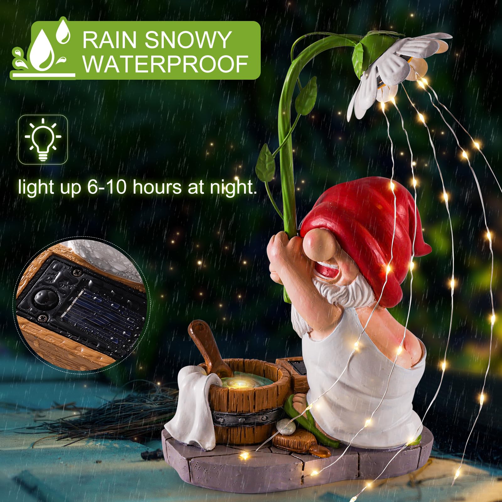 - Funny bating gnome Design:Crafted with a charming and fun bathroom gnome.(10.63*6.3*3.94inch) Standing under these big daisy petals like gnome's taking a shower. With a total of 31 lights that shine brightly,adding a lovely glow at night
