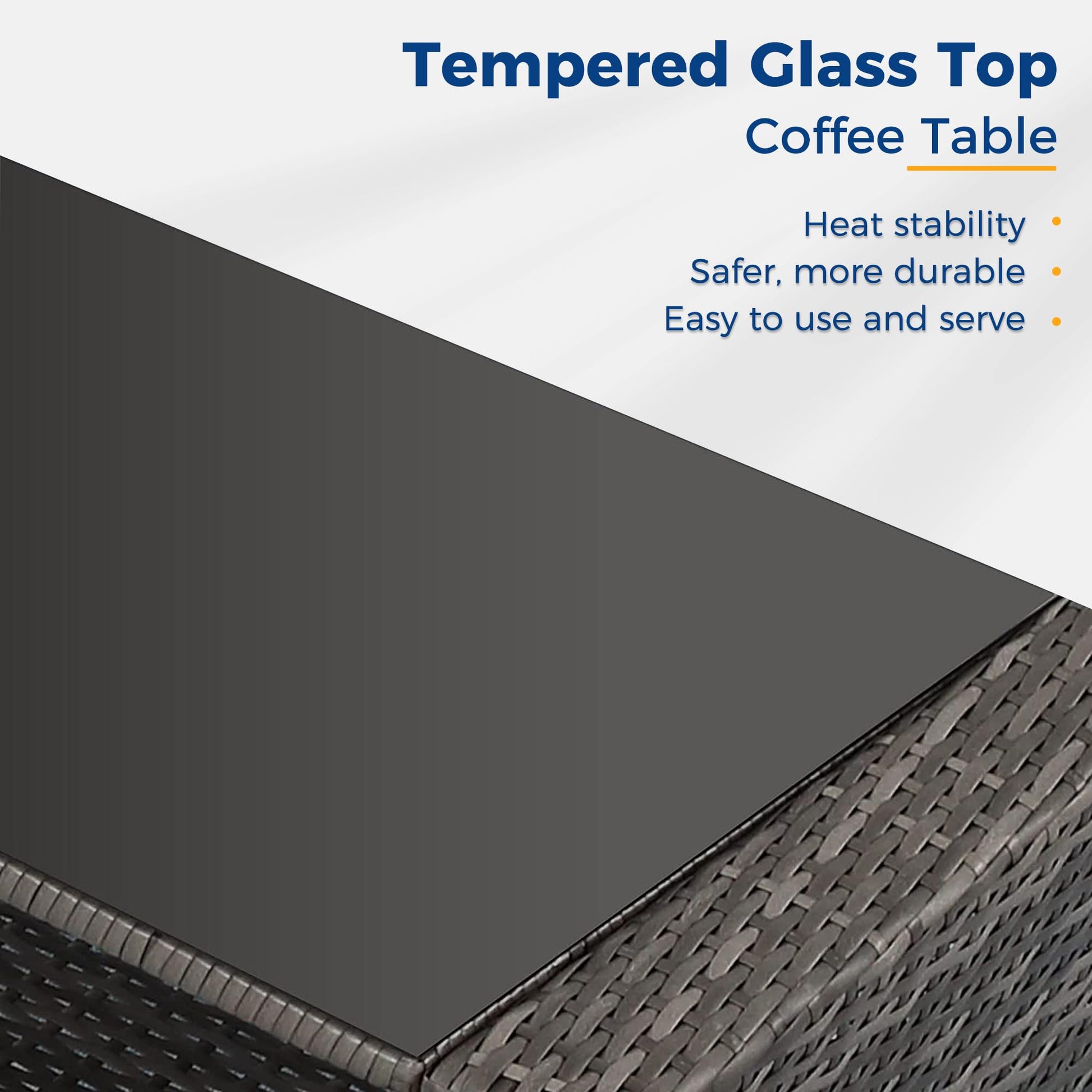 - 【Easy to Maintain】Cleaning and maintaining this patio furniture set is a breeze! The cushion covers can be easily removed with the zipper design, allowing for convenient cleaning. The splash-proof material ensures hassle-free maintenance. Additionally, the tempered glass top of the coffee table can be cleaned by simply soaking a towel in fresh water. For tough stains, soak the towel in water at 100°F for effective cleaning.