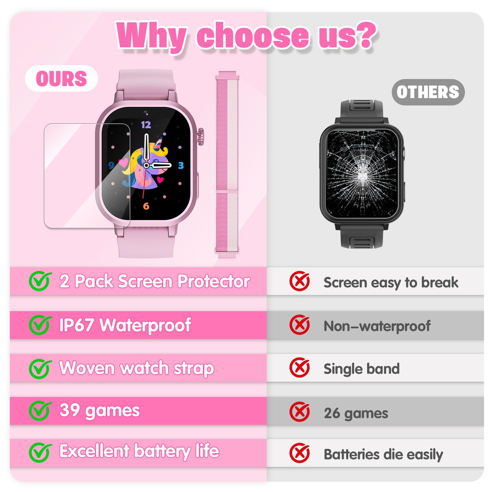 - 39 Puzzle Games: As the upgraded kids smart watch, with 36 games and 3 sports games to choose from kids. These games are more playable and suitable for children of multiple ages. That can effectively exercise kids logical thinking ability, reaction ability and hand-eye coordination. It is ideal toys for girls 8-10. There are support parental control function that can limit children's game time.
