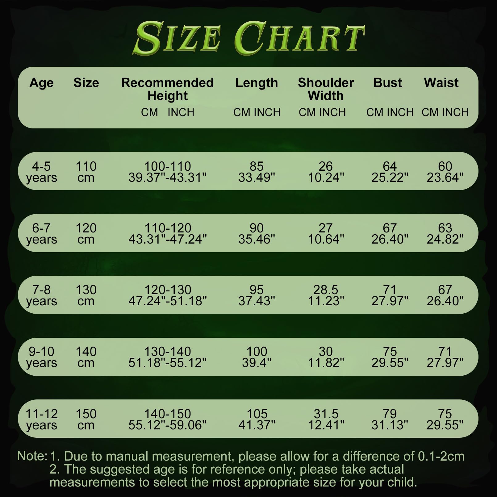- 📏 Available in Multiple Sizes: This Halloween costume for kids is available in sizes 110–150 cm. Please refer to the size chart before ordering. Manual measurement tolerance: 0.4–1.18 inches. A must-have witch costume that fits just right