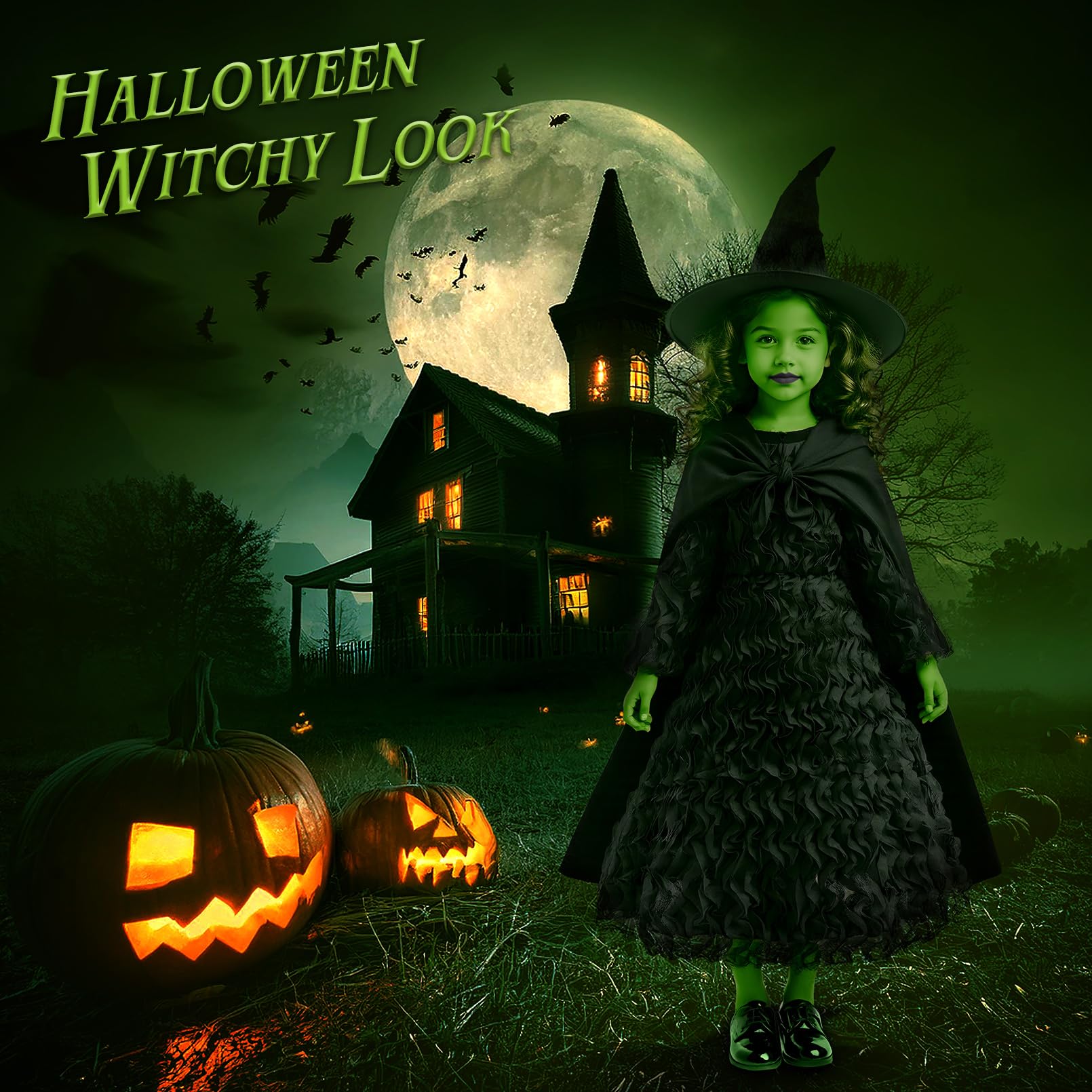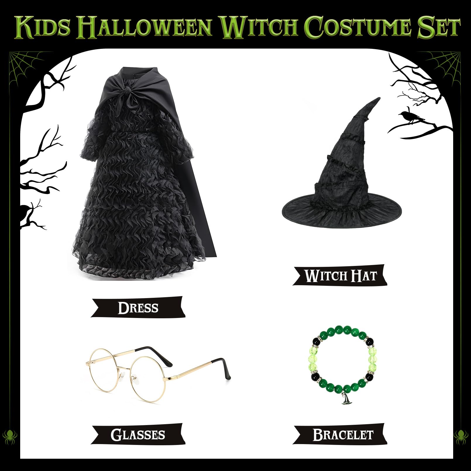 - 🎁 Stunning All-in-One Witch Costume for Kids: A full witch costume kids will love! Includes a ruffled black dress, classic witch hat, stylish glasses, gemstone bracelet, and a matching cape. It’s the ultimate witches costume for kids—fun to wear, mix & match, and ready for Halloween magic