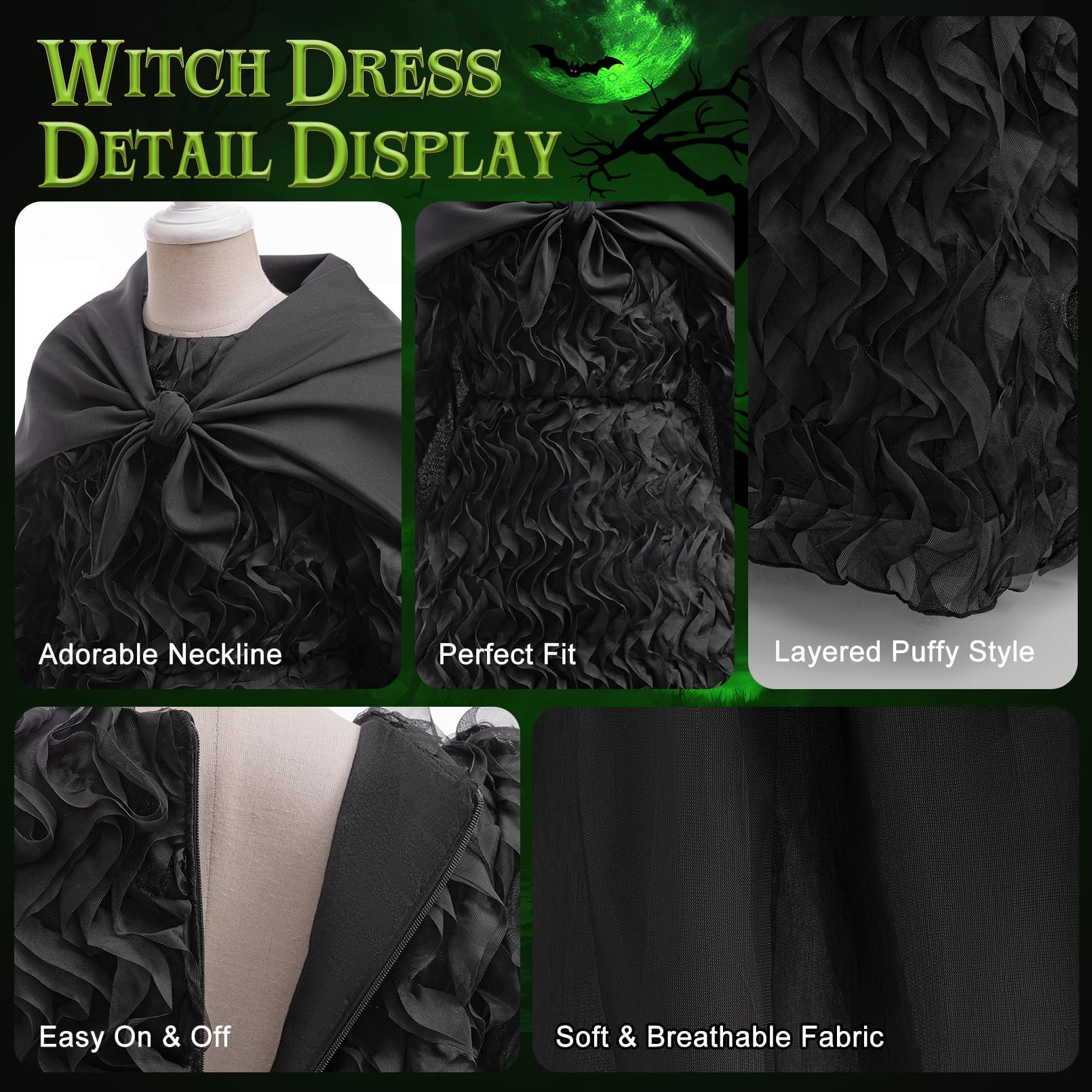 Witch Costume for Girls - Halloween Costume for Kids, Black Ruffled Witch Dress with Witch Hat, Cape, Glasses Cosplay Outfit