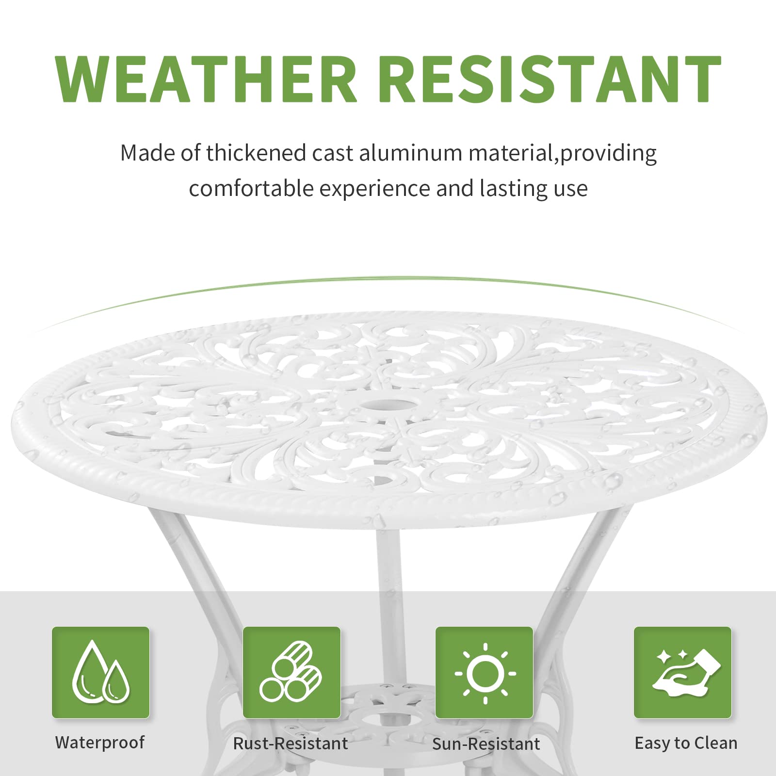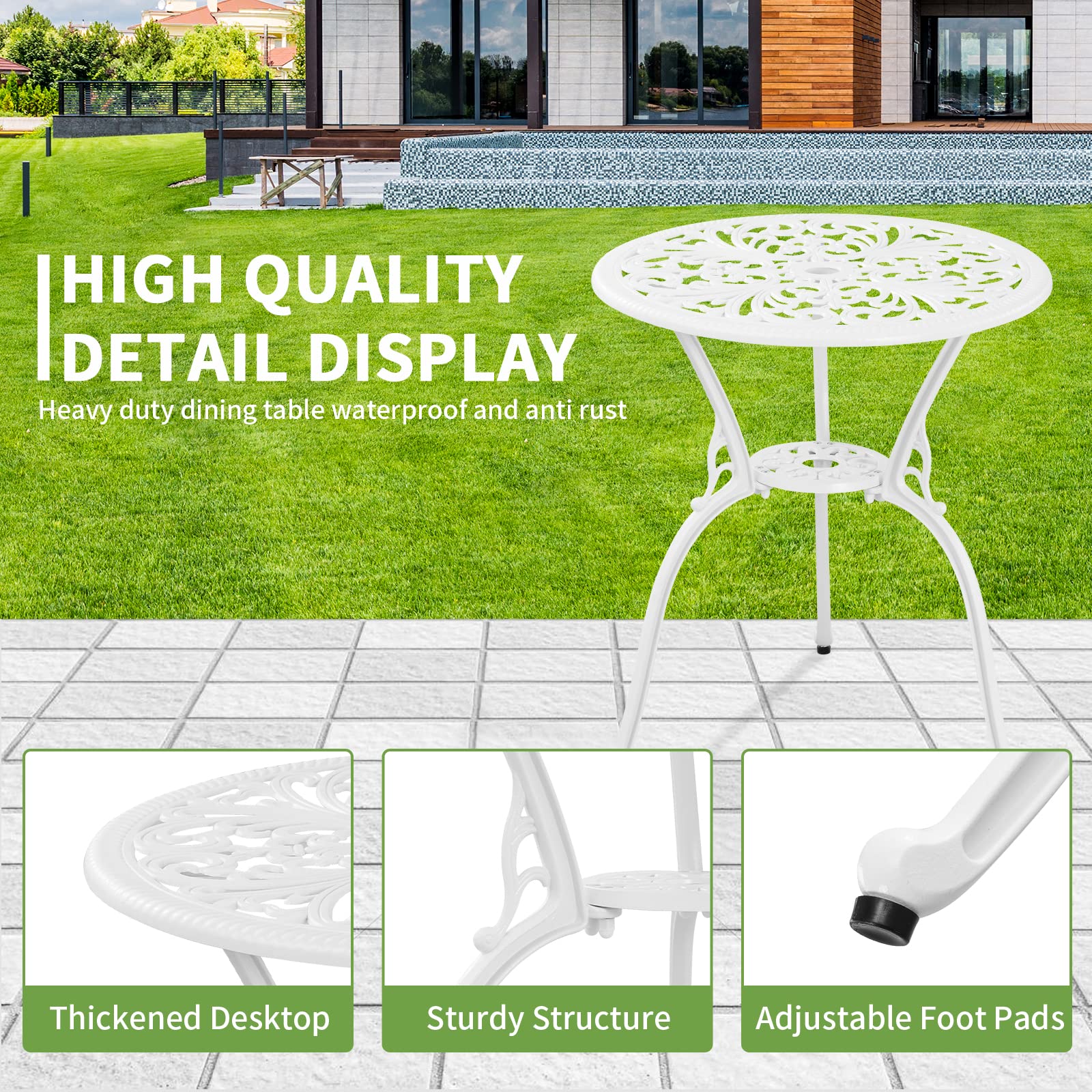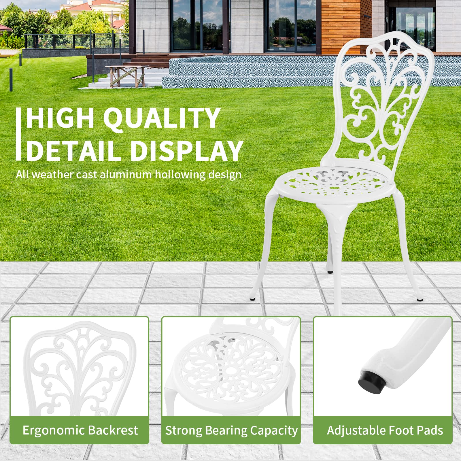 - 【Patio Furniture Set High Quality Materials】: Outdoor bistro set is made of cast aluminum, with cast aluminum frame, environmental protection coating, weather resistance, rust prevention, oxidation prevention, convenient maintenance, firmness and durability. The surface of tables and chairs is smooth without burrs, and it is very comfortable to sit up