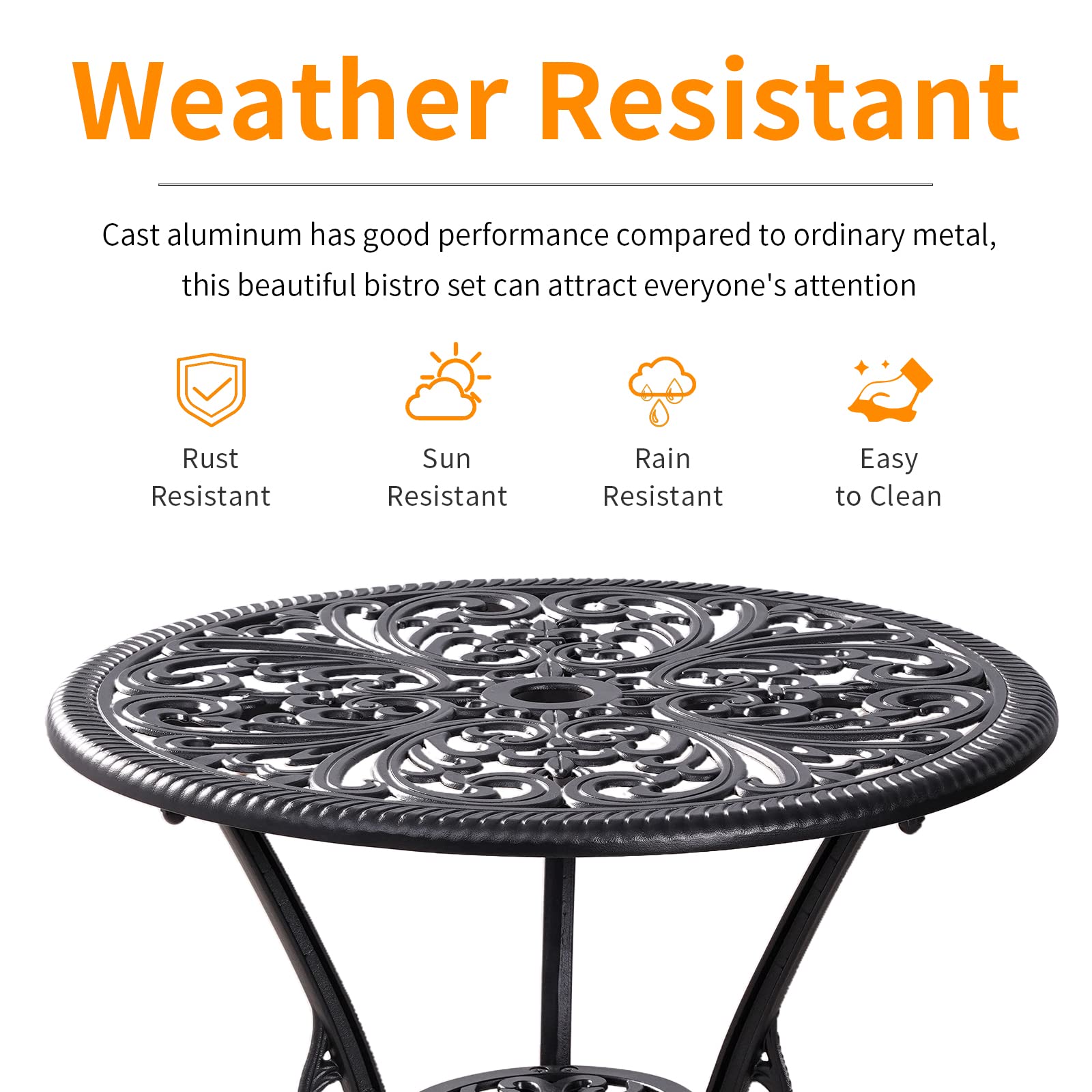 - 【Fit an Umbrella】1.97" Umbrella Hole on the bistro table set can be filled with a patio umbrella (not included), protecting you from the UV and rain. heavy duty cast aluminum frame and smooth edge detail providing you with peace of mind. With its perfect size, this bistro table set is an excellent addition to your outdoor space.
