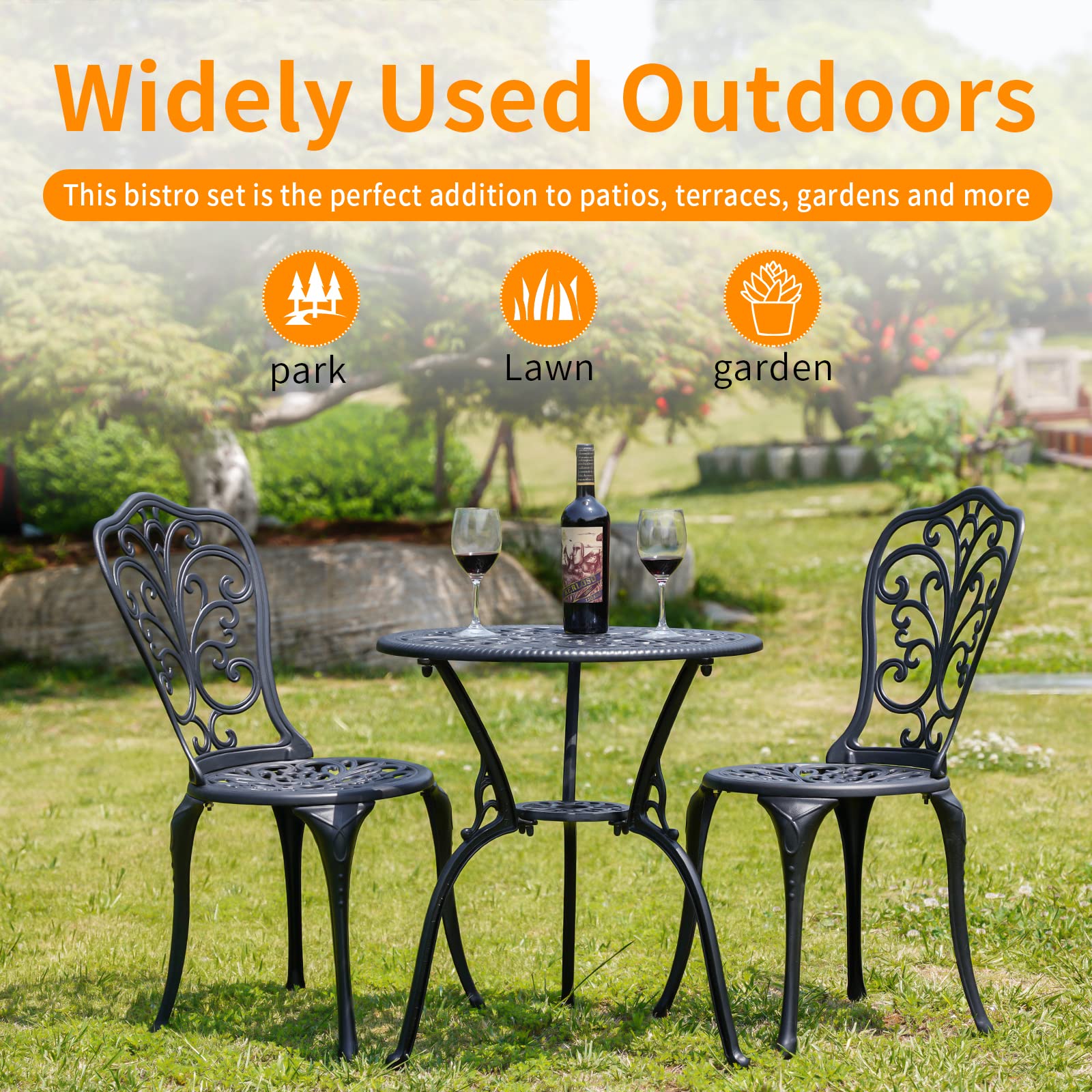 - 【All-Weather Cast Aluminum Patio Furniture】The bistro set 3 piece outdoor is made of solid cast aluminum with a waterproof and anti-rust coated finish, all accessories are also made of antirust material, weather resistant, rust and oxidation resistant, sturdy construction will use for long years