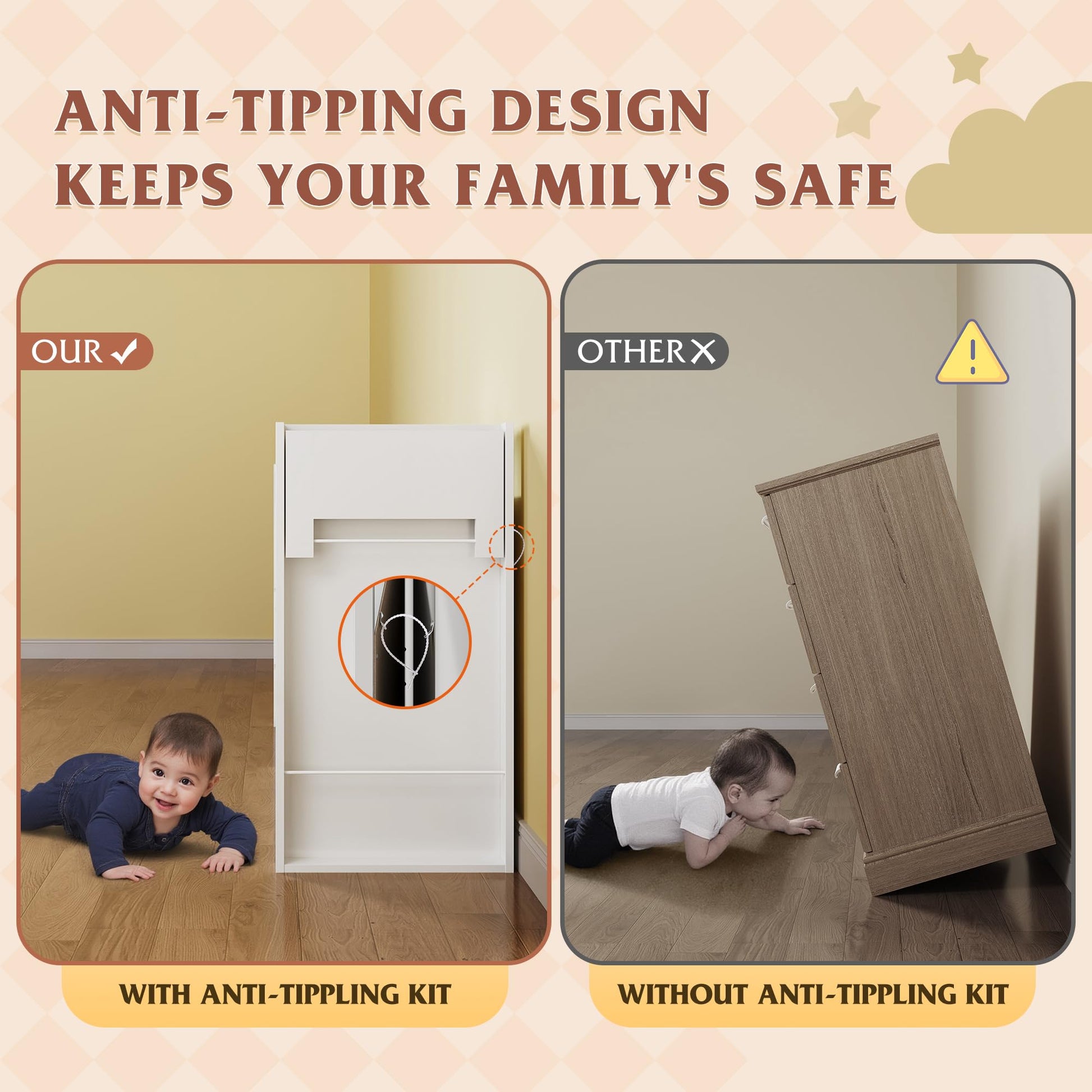 - ă⨠Stable Structure Safety AssuredăThis bedroom dresser is designed with thick columns on both sides and a reinforced base at the bottom. The entire Storage Dresser bearing up to 228LBS can still remain stable without tipping. Additional anti-tilt device can easily fix the cabinet to the wall, ensuring the safety of you, your family and pets, and enjoying a convenient life!