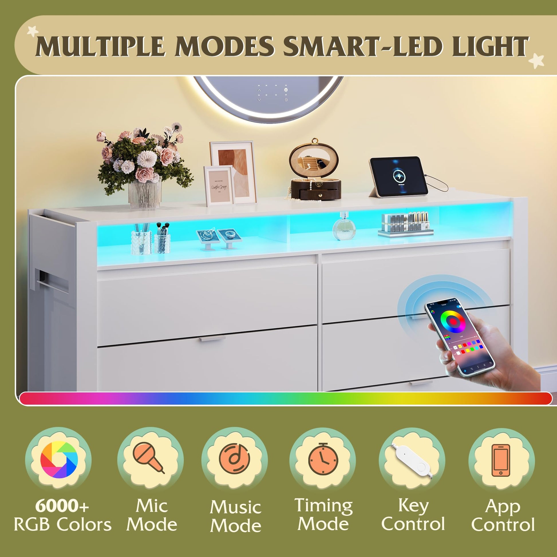 - ăđ Multifunctional LED Dresseră60000 color rhythm, define your space mood with one click, easily adjust the light intensity and speed level via remote control or APP. It flexibly adapts to various scenes such as bedroom, living room, esports room, and the lighting can be synchronized with music to provide a personalized atmosphere for movie nights, games, and family gatherings!