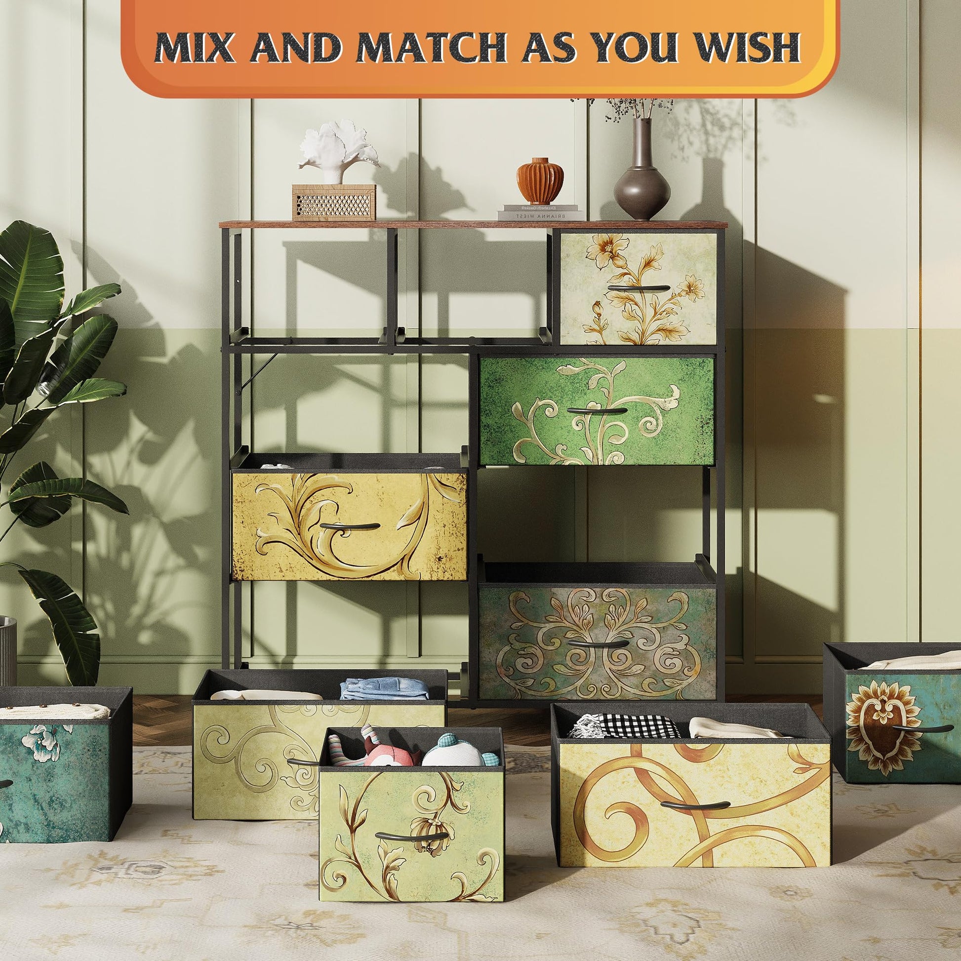 WLIVE 9-Drawer Dresser, Fabric Storage Tower for Bedroom, Hallway, Entryway, Closet, Tall Chest Organizer Unit with Fabric Bins, Steel Frame, Wood Top, Easy Pull Handle, Floral Painted