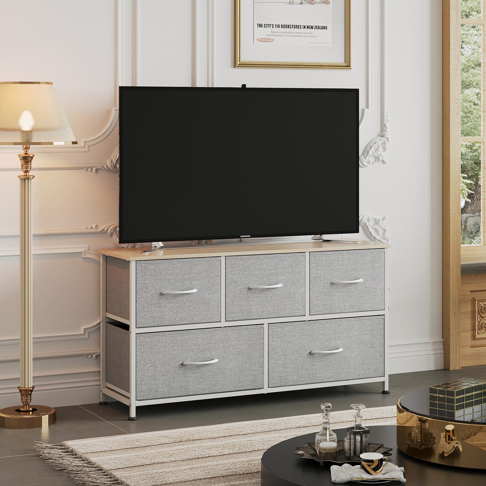 - STURDY ORGANIZER UNIT: Strong steel frame offers stable support and ensures years of use; Non-woven fabric bins are easy to clean. The dresser can also be used as TV stand for small-size TV.