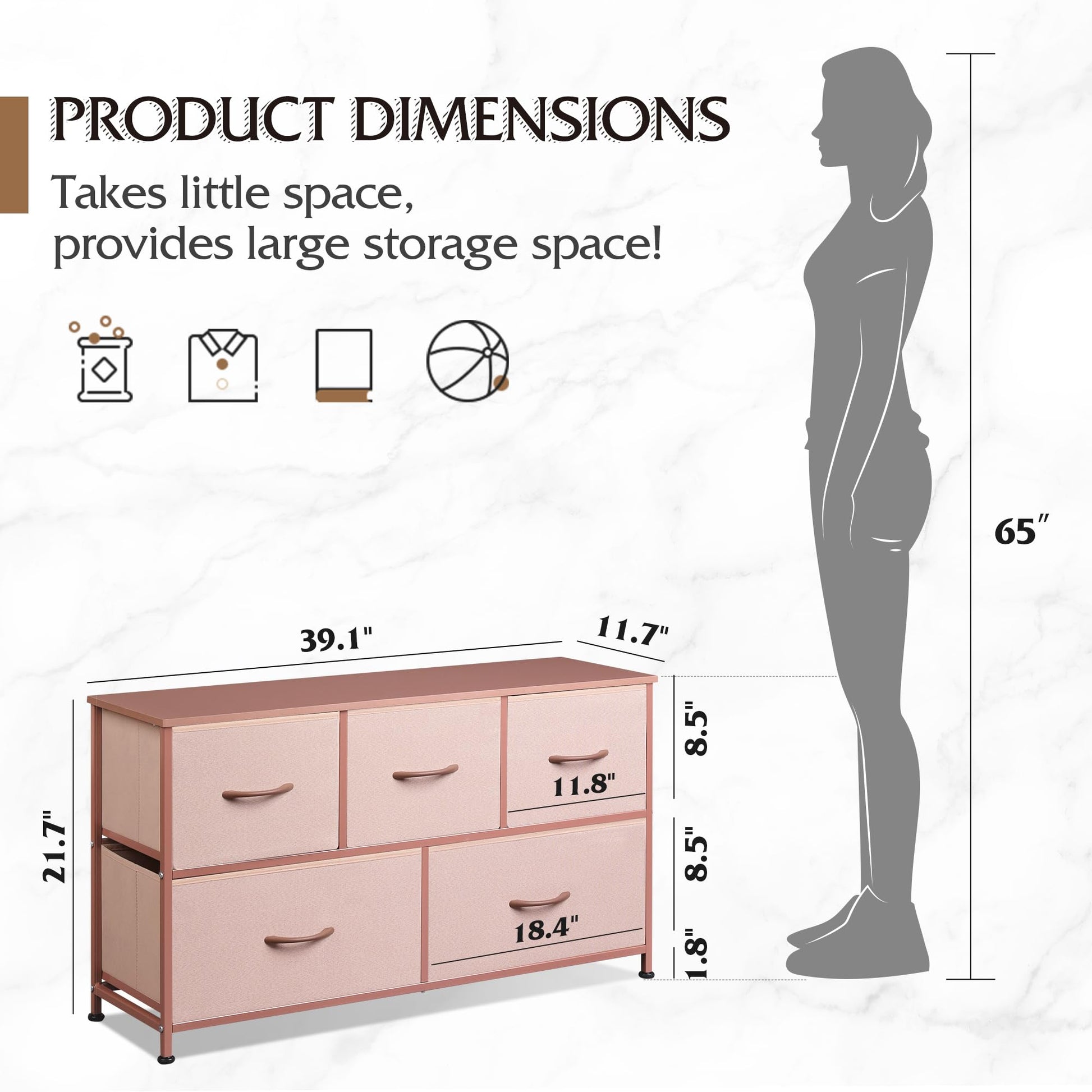 WLIVE Dresser for Bedroom with 5 Drawers, Wide Chest of Drawers, Fabric Dresser, Storage Organization Unit with Fabric Bins for Closet, Living Room, Hallway, Pink and Rose Gold